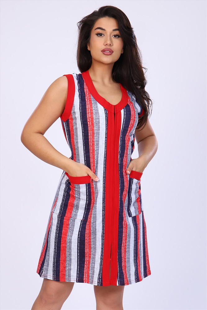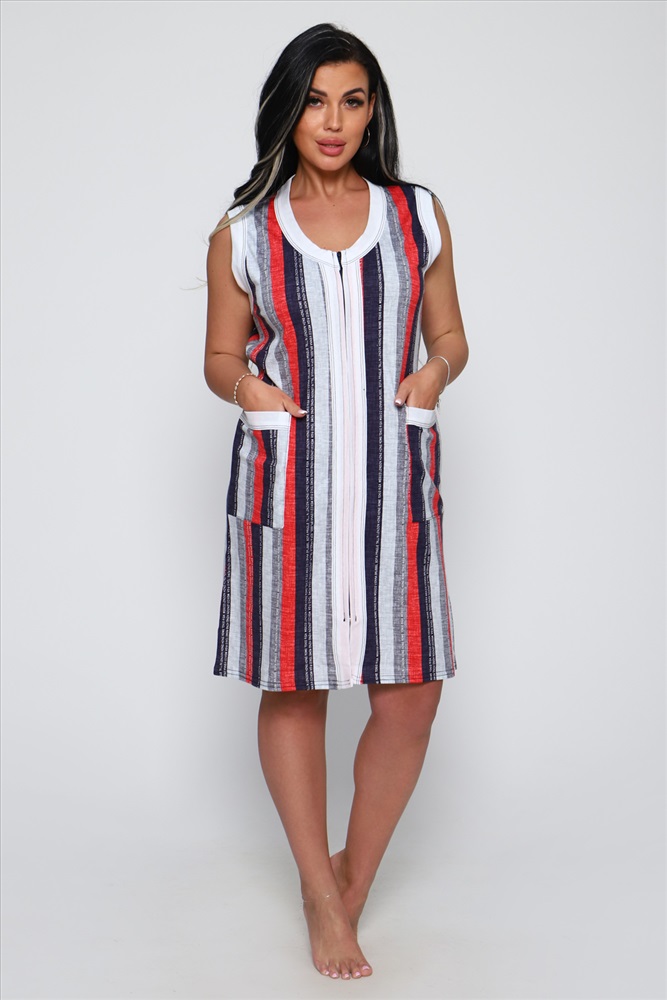 Состав: 100% хлопок Модель: Халат 39027 Тип товара: халат Материал: кулирка | кулирка Бренд: Натали Суслова Длина: средняя длина Карман: накладные Назначение: для дачи | для дома НДС: Без НДС Отделка: с карманами | с поясом Рейтинг: Рейтинг 4 и выше Рисунок: надпись | полоска Рукав: без рукава Сезонность: лето | осень | весна Силуэт: полуприлегающий Стиль: домашний | молодежный Воротник: без воротника Застежка: молния Халат женский оригинальной летней расцветки, выполнен из 100% хлопка. Халат на молнии средней длины, рукав короткий. Выполнен из кулирки, с двумя карманами. Общая длина приблизительно до коленей, очень приятный к телу. Таблица размеров и веса