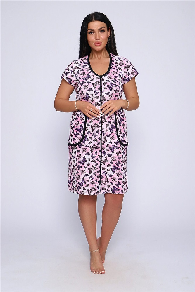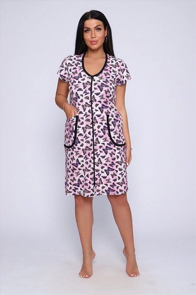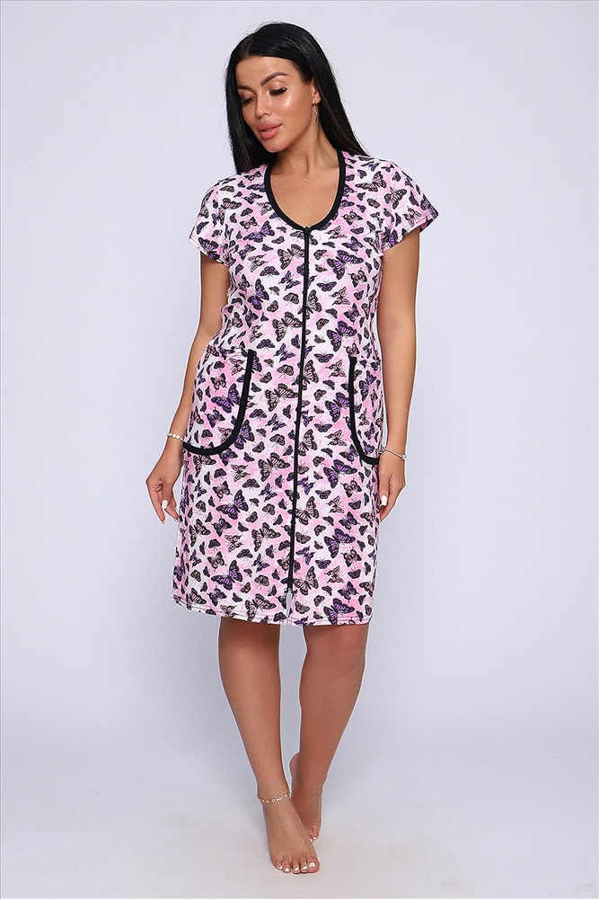 Халат женский оригинальной летней расцветки, на молнии, с боковыми карманами, с коротким рукавом, изготовлен из трикотажного полотна кулирка выполнен из 60% хлопка, 40% полиэстера. Выполнен из кулирки. Общая длина приблизительно до коленей, очень приятный к телу.