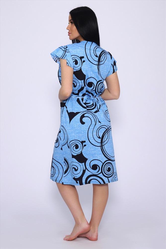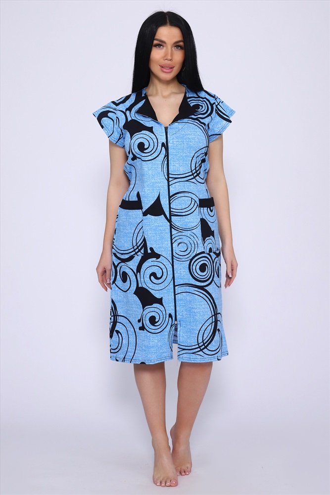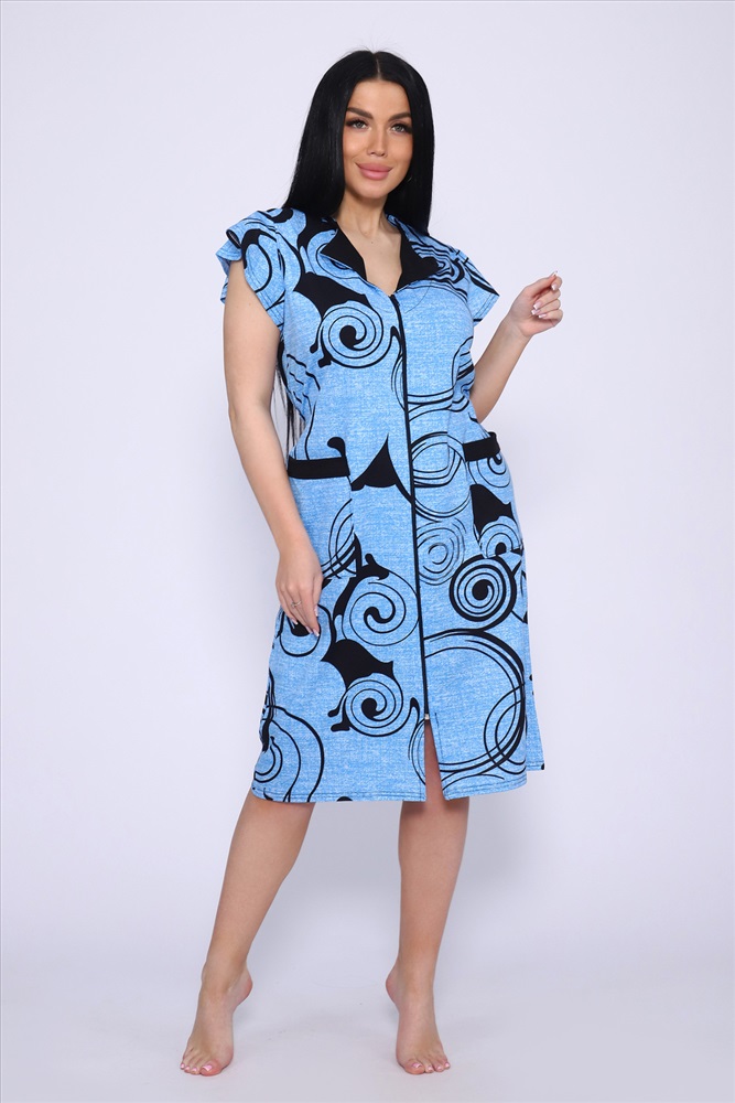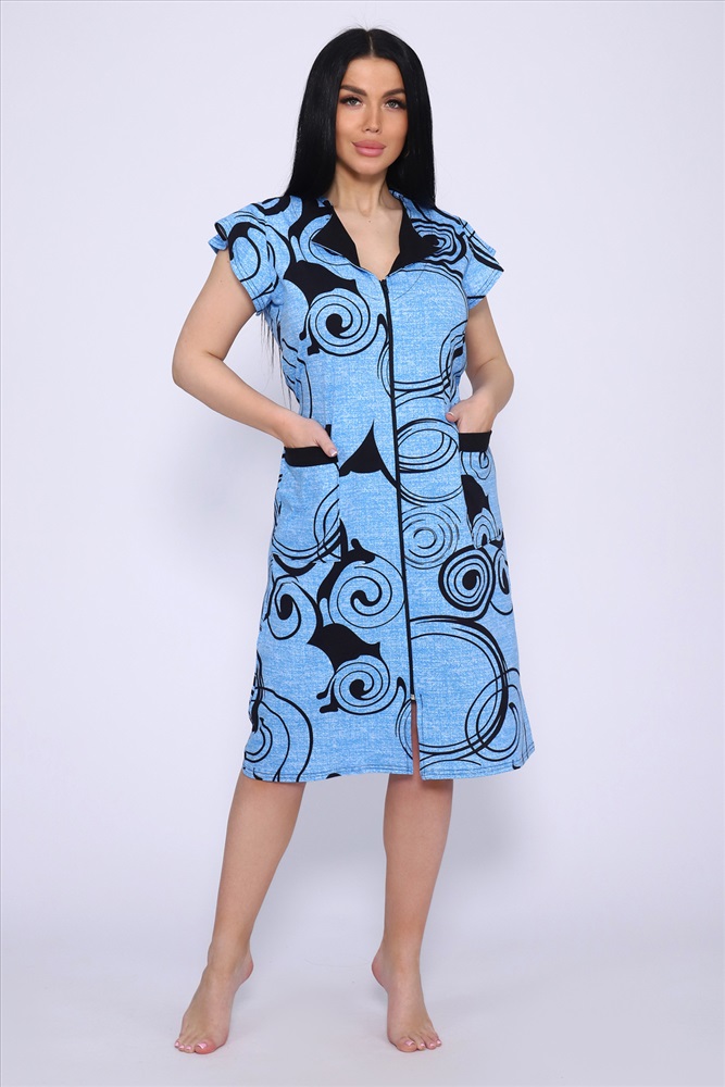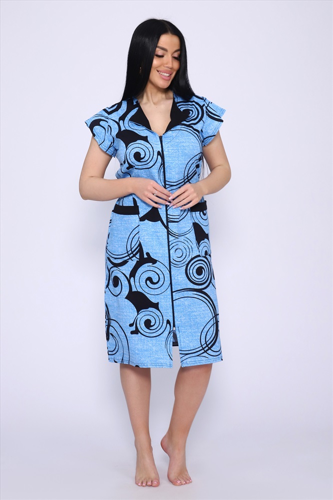 Застежка: молния Оригинальный женский халат с красивым принтом на ткани. Рукав короткий в форме крылышка, с накладными карманами, отложной треугольный воротник. Застежка-молния, длина ниже колена, очень приятный к телу.