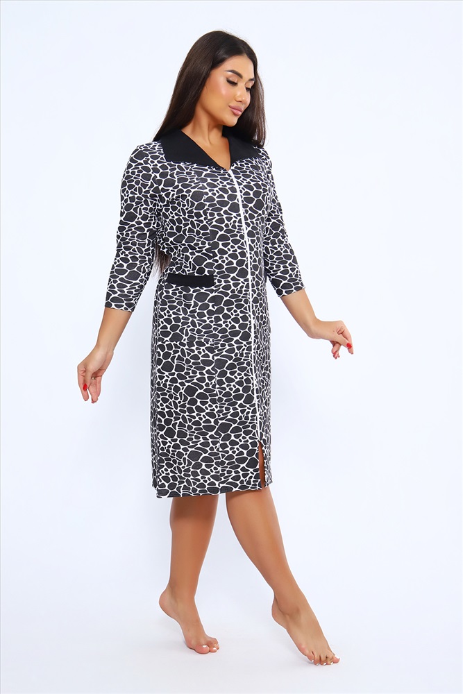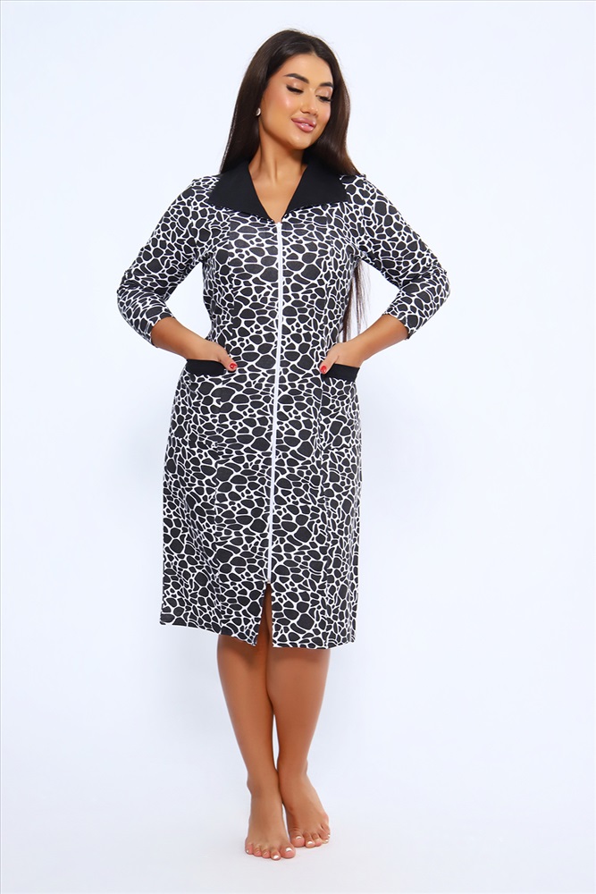 Состав: 60% х/б, 40% полиэстер Модель: Халат 39047 Тип товара: халат Материал: футер 2-х нитка с начесом | футер 2-х нитка с начесом Бренд: Натали Суслова Длина: средняя длина Карман: накладные Назначение: для дома НДС: Без НДС Особенности: с начесом Отделка: с карманами Рисунок: анималистичный Рукав: рукав 3/4 Сезонность: зима Силуэт: прямой | свободный Стиль: домашний Воротник: отложной воротник Застежка: молния Этот халат выполнен из ткани с контрастным черно-белым принтом, напоминающим узор гальки. Длина халата до колена, рукава 3/4, что делает его удобным для повседневного использования. Впереди имеется молния, что обеспечивает легкость в надевании и снятии. Воротник черного цвета добавляет строгий акцент к общему дизайну. По бокам расположены карманы, которые не только функциональны, но и декоративно подчеркивают силуэт. Этот халат прекрасно подойдет для домашнего комфорта, сохраняя при этом стильный и современный вид. Таблица размеров и веса