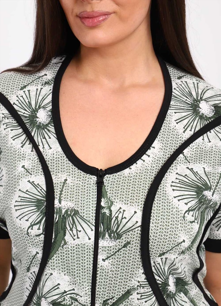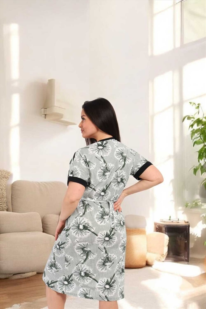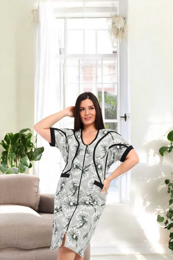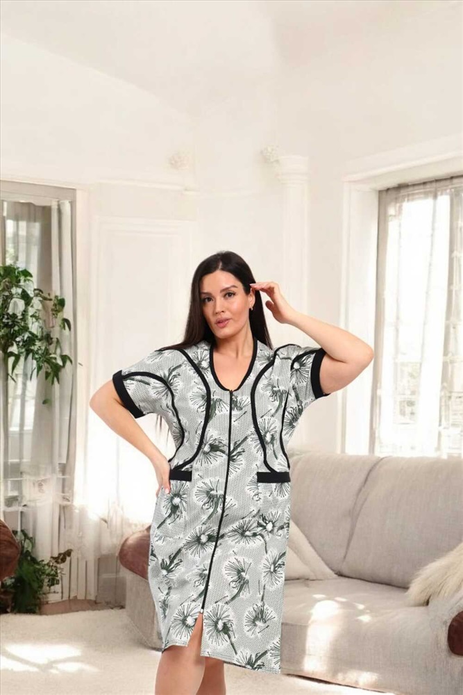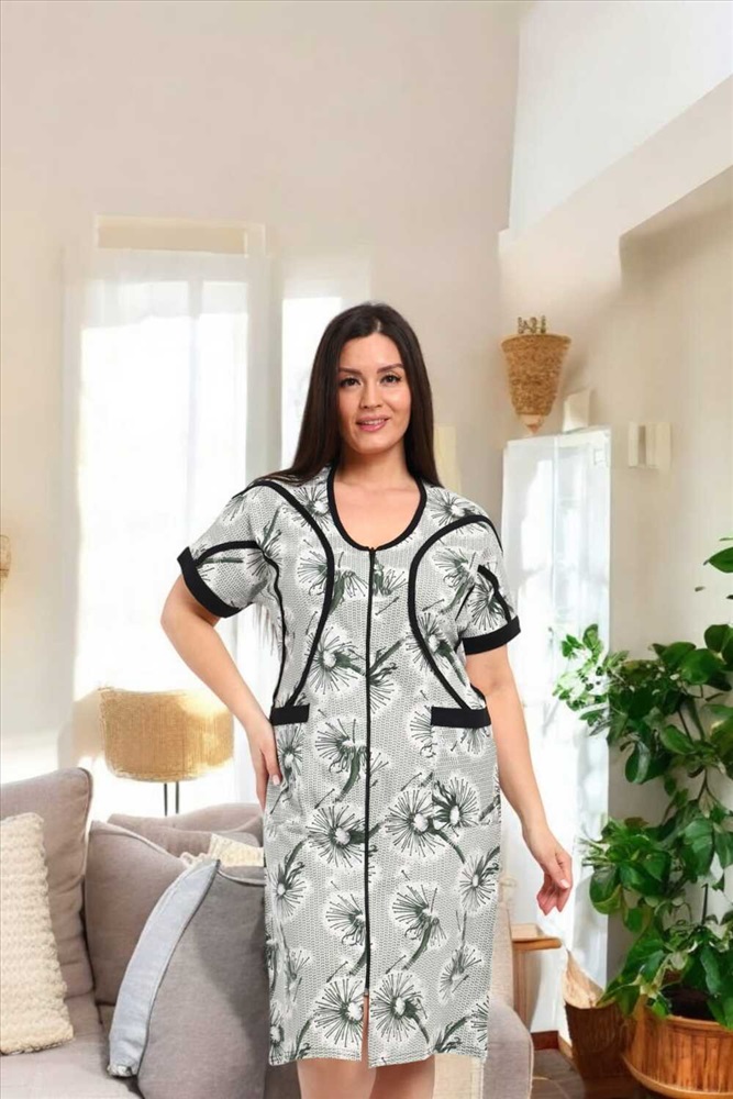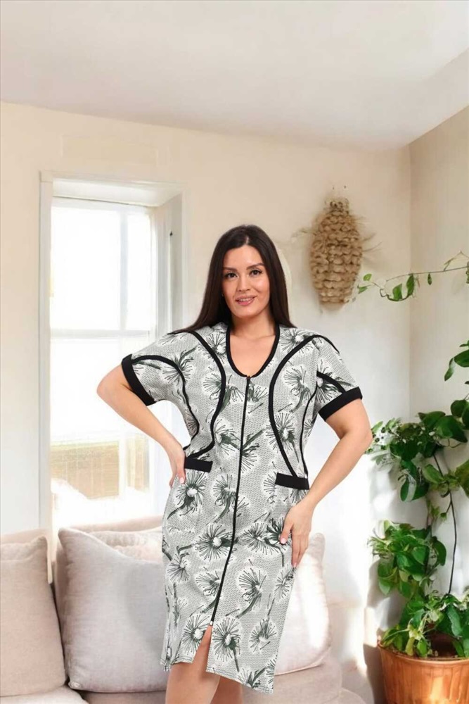 Застежка: молния В удобном домашнем халате на молнии с короткими рукавами и длиной до колен. Халат выполнен в светлых тонах с изящным цветочным принтом и дополнен контрастной черной окантовкой, придающей ему стильный вид. Функциональные карманы спереди делают модель практичной для повседневного ношения.