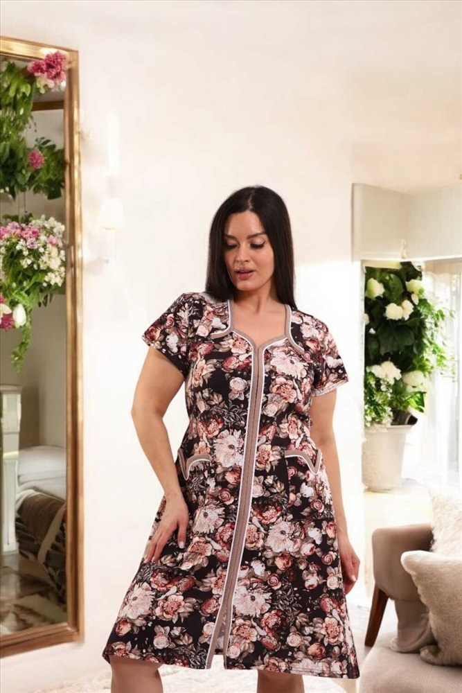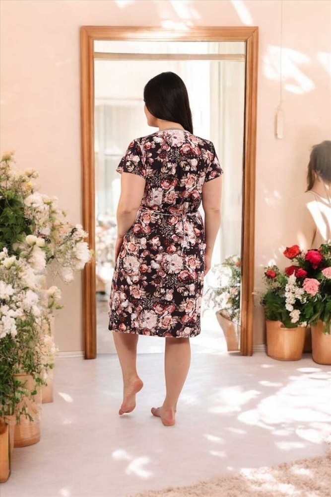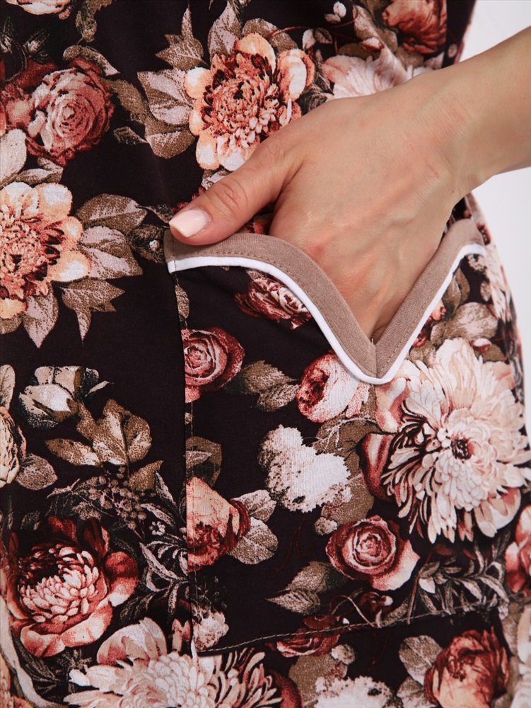 Состав: 100% хлопок Модель: ХАЛАТ 39056 Тип товара: халат Материал: кулирка | кулирка Бренд: Натали Суслова Карман: накладные Назначение: для дома НДС: Без НДС Отделка: с карманами Рисунок: цветы Рукав: короткий рукав Сезонность: лето | осень | весна Силуэт: свободный Стиль: домашний Воротник: без воротника Застежка: молния Элегантный и комфортный халат, выполненный из мягкого, дышащего трикотажа. Модель средней длины с короткими рукавами и удобной застёжкой на молнии по всей длине. Изысканный цветочный принт в розово-бежевых тонах на тёмно-коричневом фоне придаёт образу женственность и уют. Прямой силуэт с лёгкой приталенностью за счёт завязки на талии сзади. Короткие рукава, удобные для повседневного ношения. Два глубоких накладных кармана с контрастной отделкой, окантовка горловины, рукавов и карманов белой и бежевой бейкой. Таблица размеров и веса