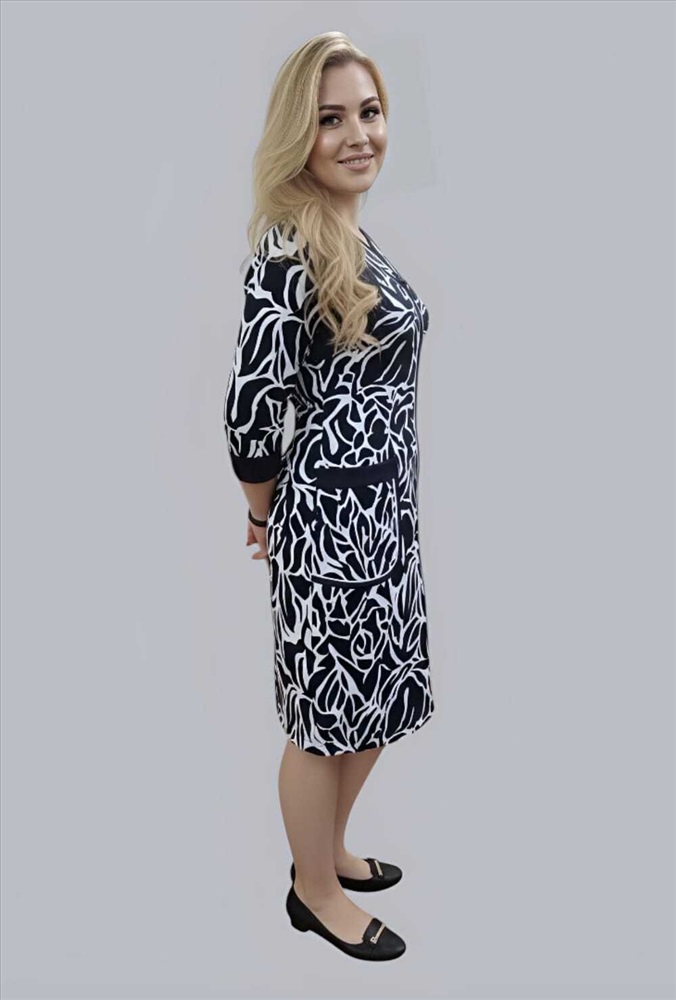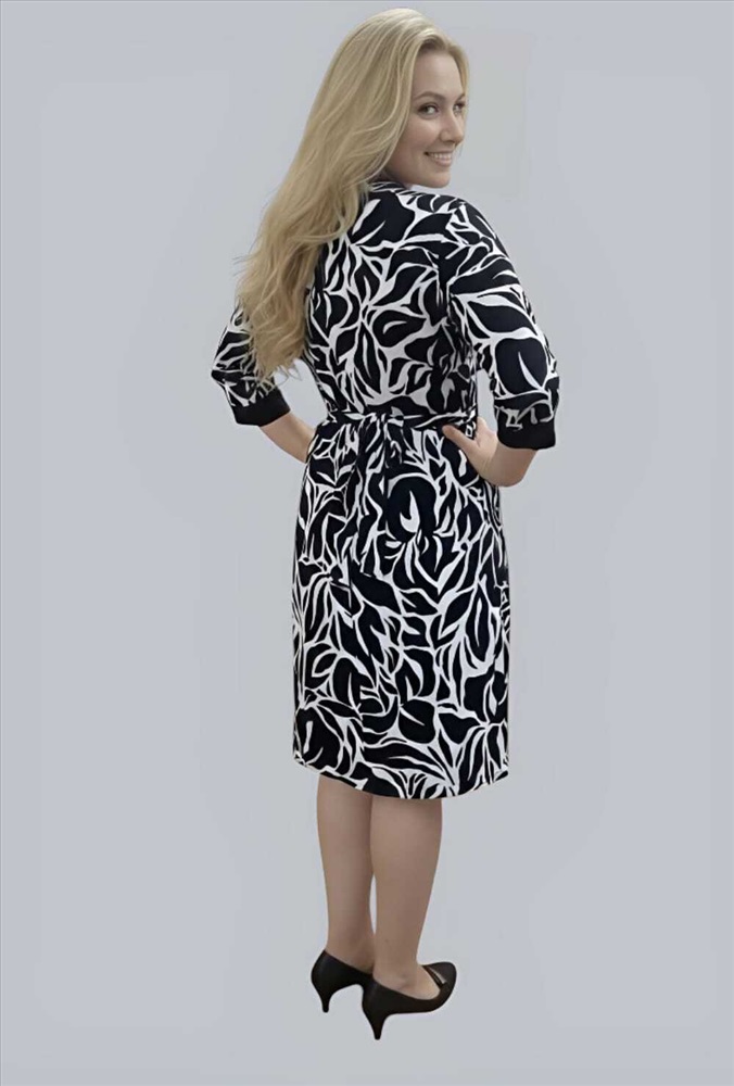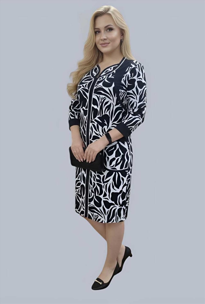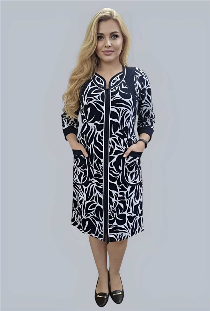 Застежка: молния Этот элегантный женский халат темно-синего цвета сочетает в себе домашний уют и изысканный стиль. Он выполнен из мягкого, приятного к телу трикотажа, который отлично держит форму и обеспечивает комфорт в течение всего дня. Халат имеет полуприлегающий силуэт длиной ниже колена. Центральная застежка на молнии по всей длине делает его практичным и удобным в использовании. Главным украшением служат контрастные белые вставки с изящным растительным (лиственным) принтом на плечах, манжетах и в нижней части изделия. Белый кант вдоль молнии и выреза горловины визуально вытягивает силуэт, придавая образу стройность. V-образный вырез подчеркивает линию шеи, рукав 3/4 открывает запястья, что удобно для домашних дел. Накладные карманы по бокам добавляют функциональности, пояс на спине позволяет регулировать степень прилегания и подчеркивает талию. Благодаря благородному темно-синему цвету и стильному принту, халат выглядит как полноценное домашнее платье. В нем можно не только отдыхать, но и встречать гостей. Качественный материал позволяет коже дышать, а продуманный крой не стесняет движений.