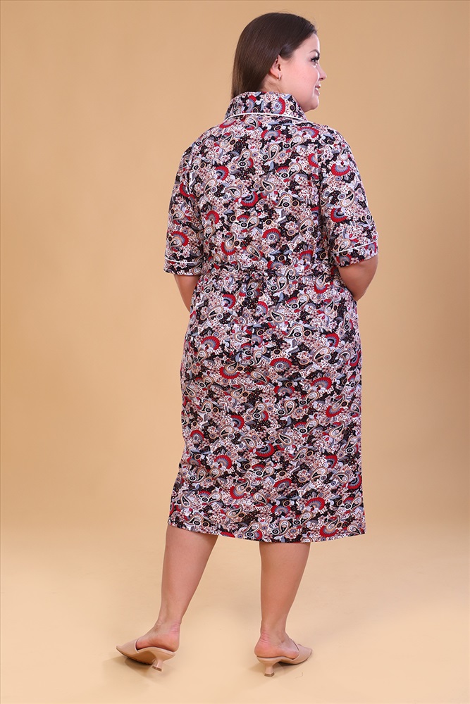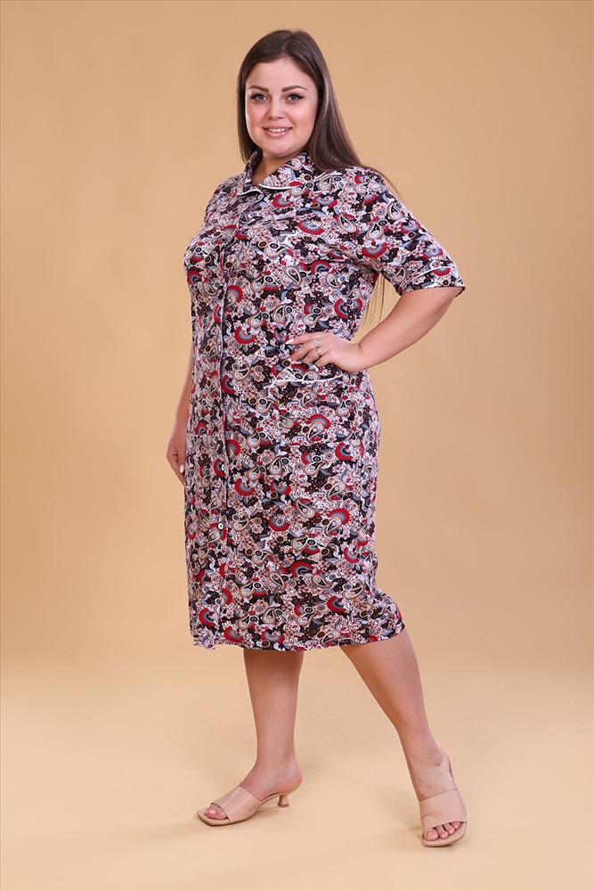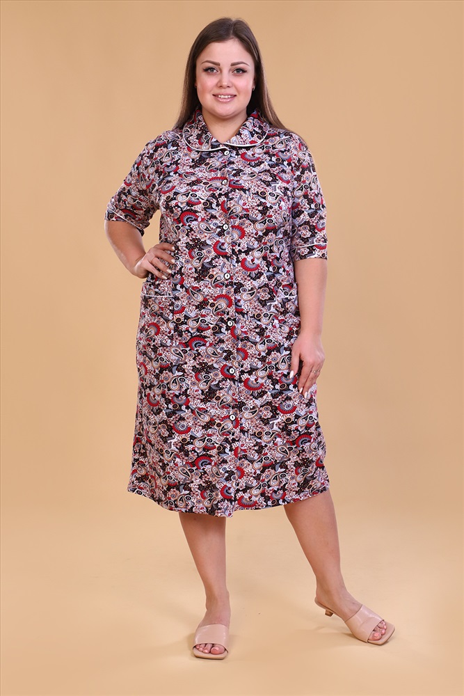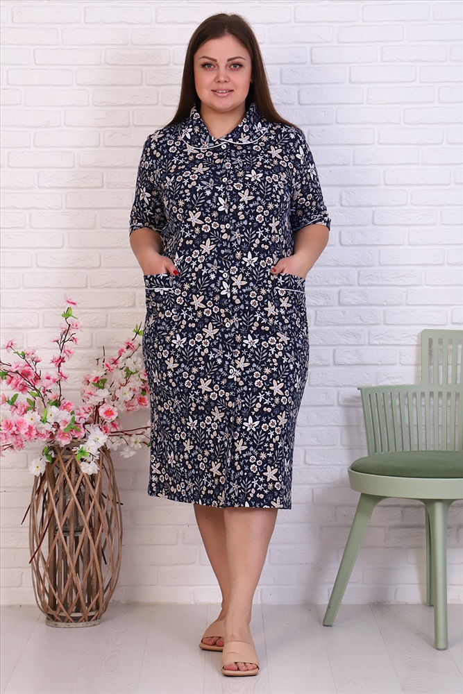 Состав: 100% хлопок Модель: Халат 42050 Тип товара: халат Материал: кулирка | кулирка Бренд: Натали Суслова Длина: средняя длина Карман: накладные Назначение: для дома НДС: 5% Отделка: с карманами | с манжетами | с поясом Рейтинг: Рейтинг 4 и выше Рисунок: узоры Рукав: рукав 3/4 Сезонность: лето | осень | весна | зима Силуэт: свободный Стиль: домашний Воротник: отложной воротник Застежка: пуговицы Халат женский на пуговицах, с отложным воротником, накладными карманами. Изготовлен из натурального хлопка. Длина изделия ниже колена, свободный покрой обеспечит вам удобство и не стеснит ваших движений. На спинке халата есть 2 полупояса, которые регулируют объем в талии. В такой модели будет удобно женщине любого возраста. На модели 52 размер Таблица размеров и веса