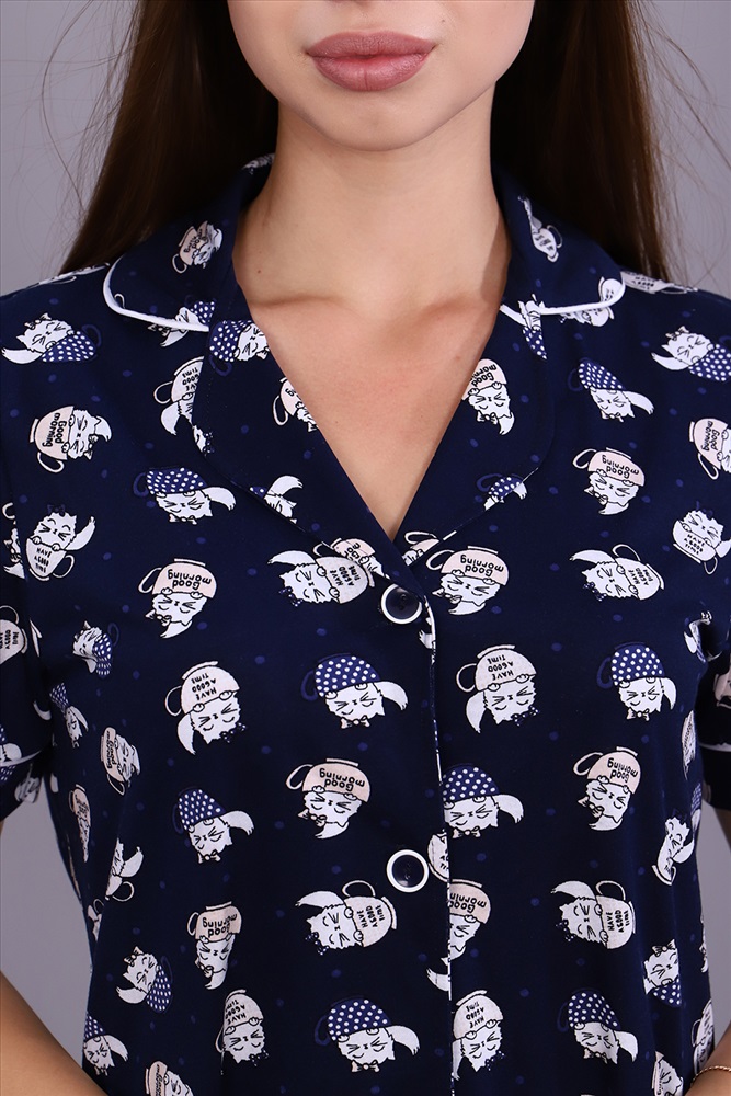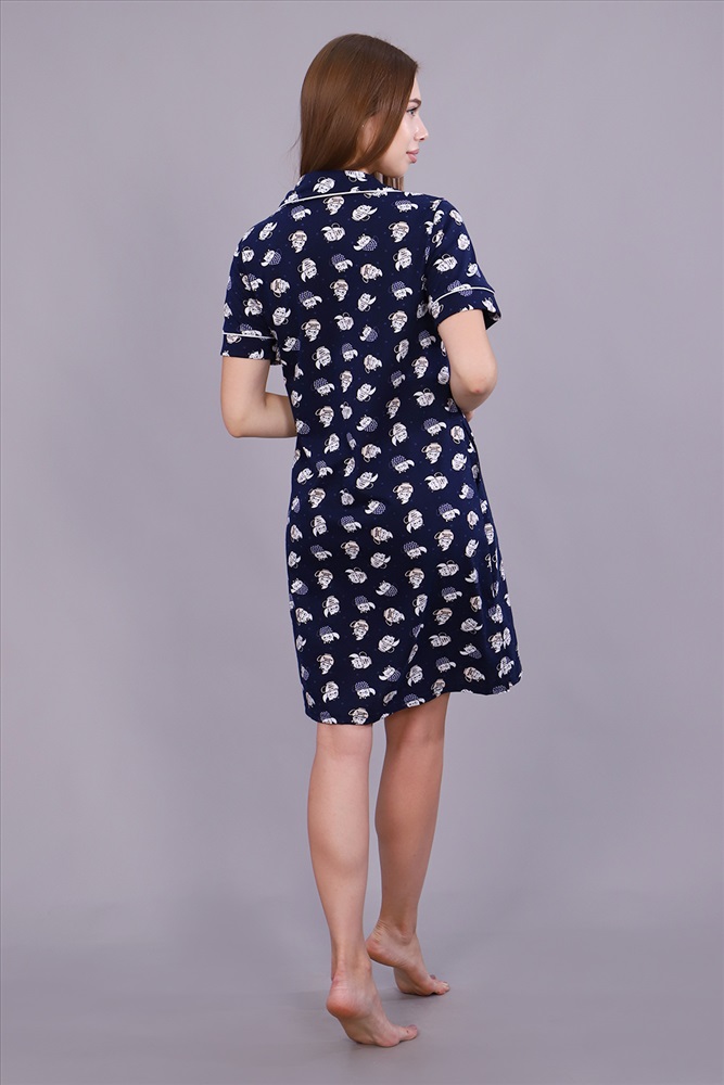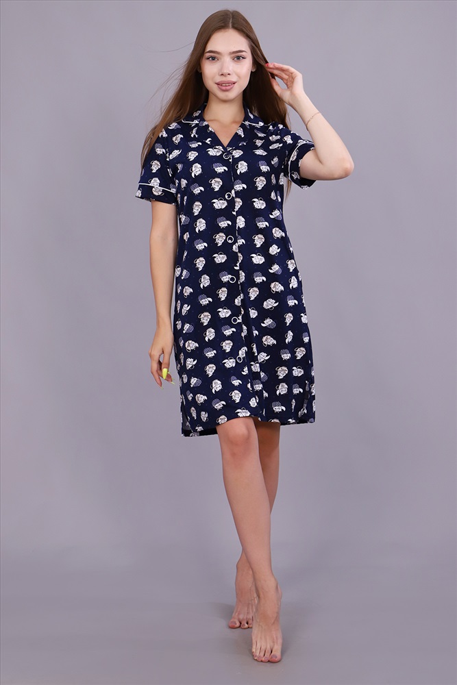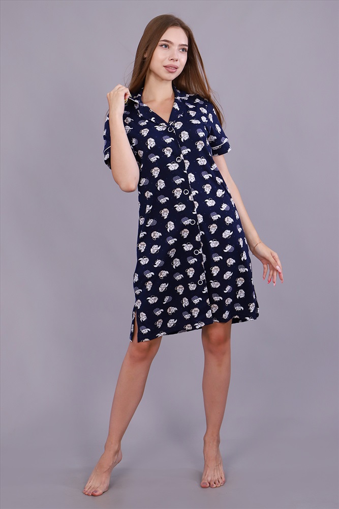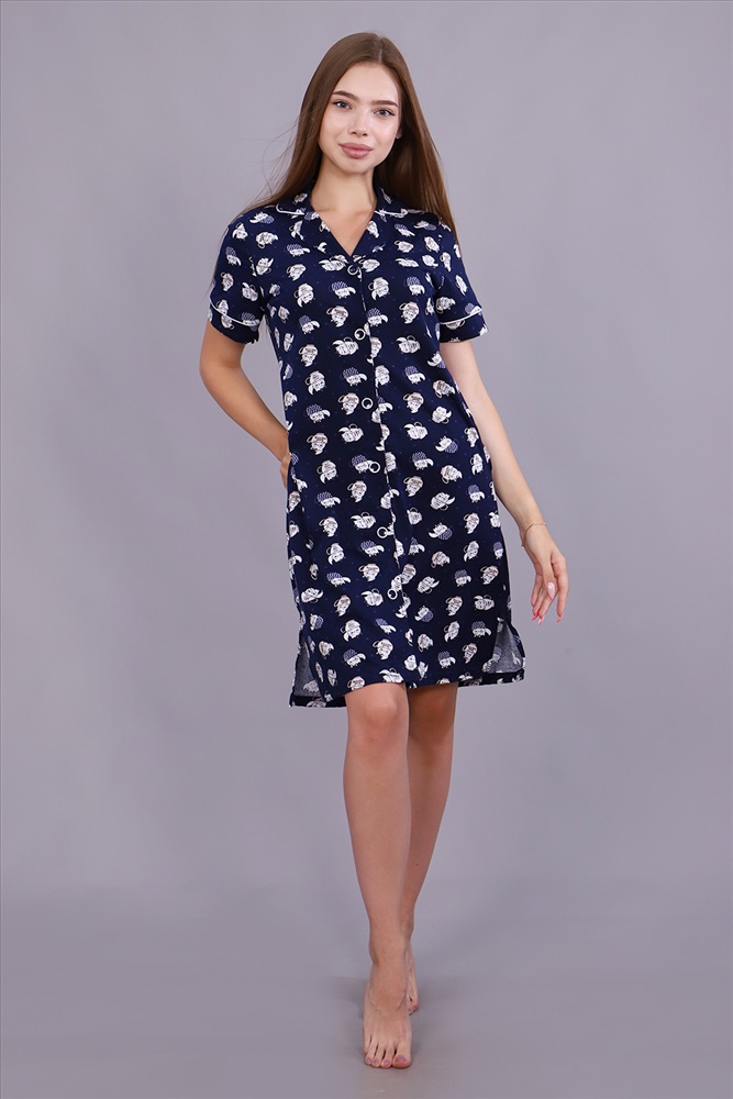 Застежка: пуговицы Халат женский из набивного кулирного полотна на пуговицах, прямого кроя, рукав короткий втачной, в боковых швах внутренние карманы. Благодаря натуральному составу вам будет комфортно и уютно. Это модель прекрасно подходит для дома, дачи, отдыха.