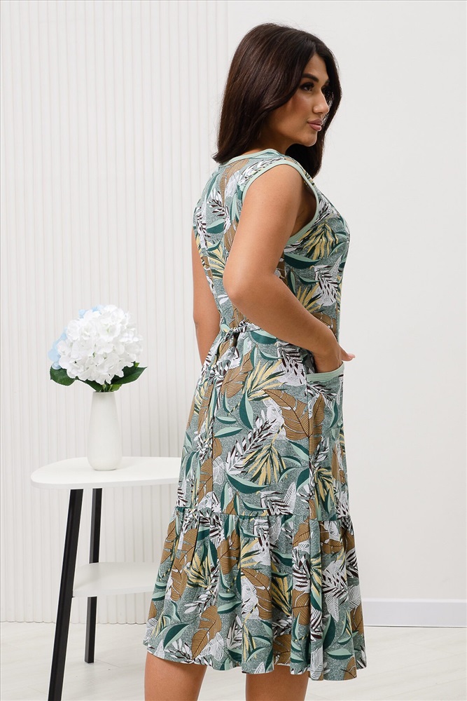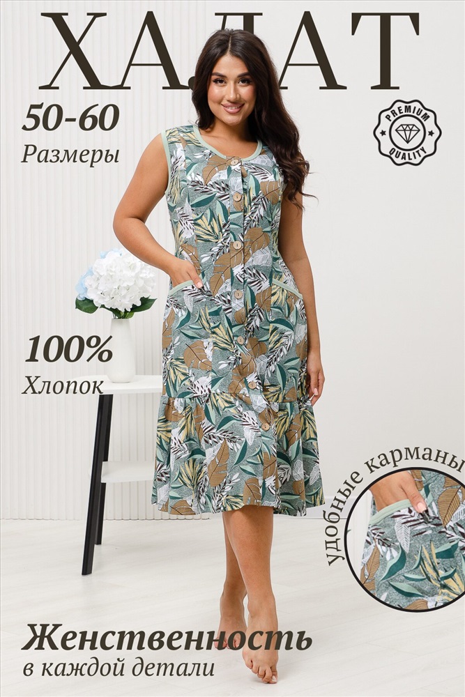 Халат женский из кулирного полотна на пуговицах, состав 100% хлопок. Крой халата прямой с воланом внизу, горловина круглая, карманы накладные, в боковых швах вшит пояс, низ обработан на плоскошовной машине. Легкий в уходе.