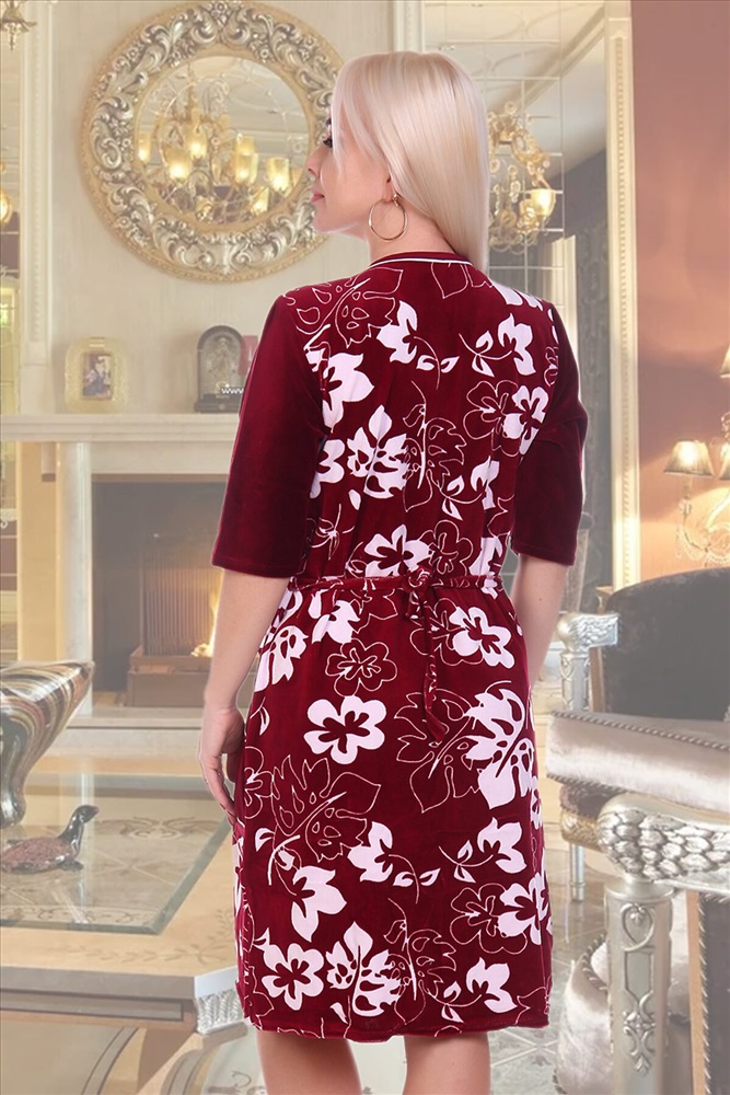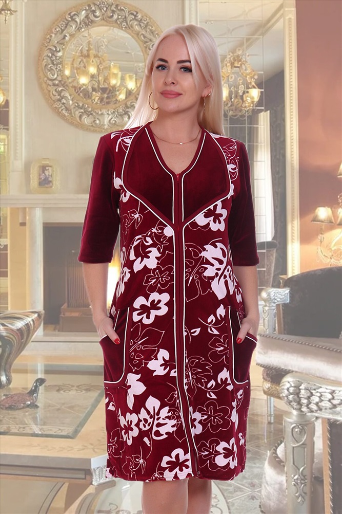 ID товара: 663465 Состав: 80% Хлопок, 20% Полиэстер Сезон: Весна/Лето Длина: До колена Фасон: Прямой Рукав: 3/4 Вид застежки: Молния Основная ткань: Хлопок | Велюр Стиль: Повседневный Страна бренда: Россия Страна производства: Россия Элегантный женский халат из велюра. Дизайн в виде белых цветочных силуэтов, белая окантовка, застегивается на молнию, рукава чуть ниже локтей, по бокам накладные карманы, общая длина приблизительно до коленей. Комментарии к товару