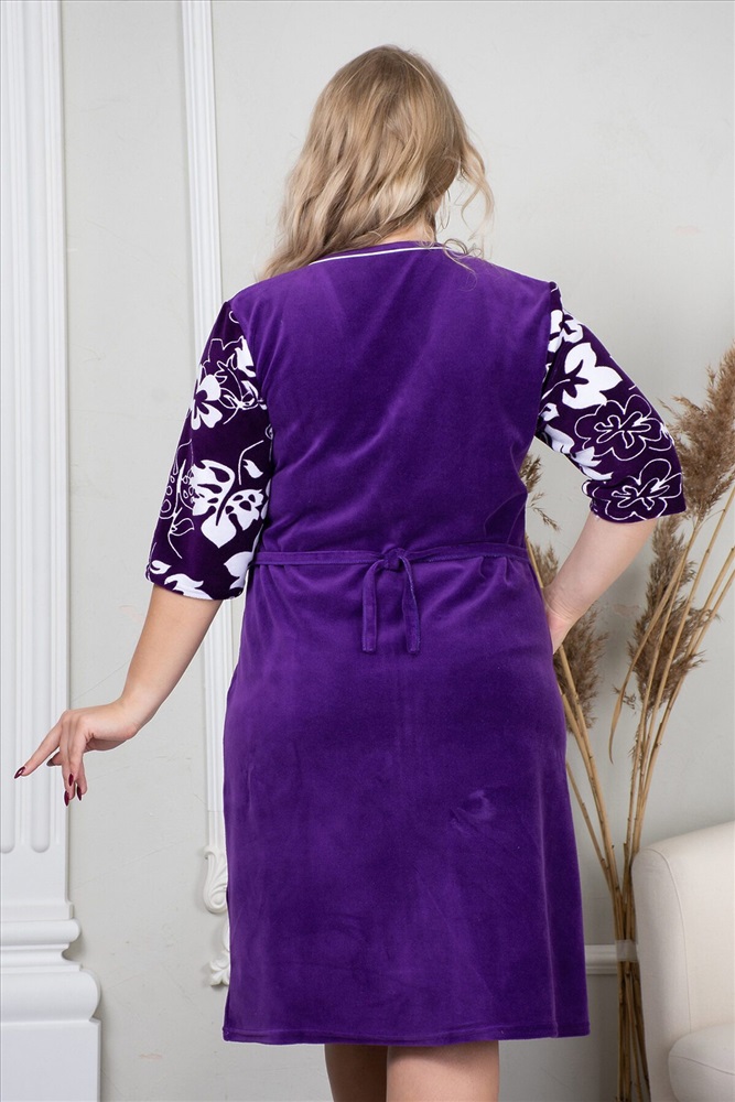 Элегантный женский халат из велюра. Дизайн в виде белых цветочных силуэтов, белая окантовка, застегивается на молнию, рукава чуть ниже локтей, по бокам накладные карманы, общая длина приблизительно до коленей.