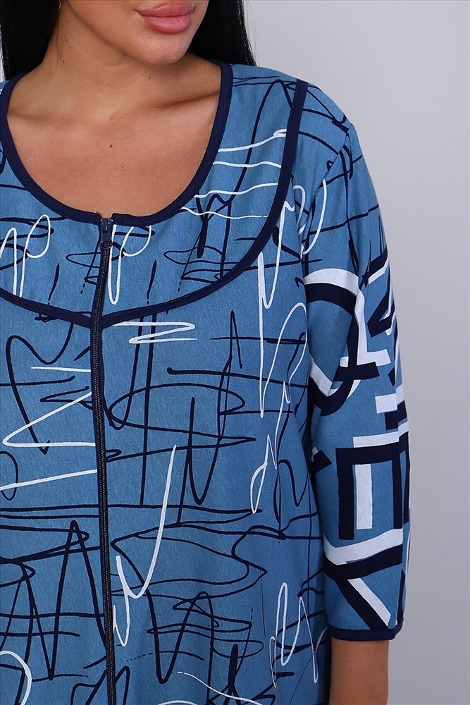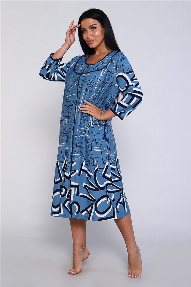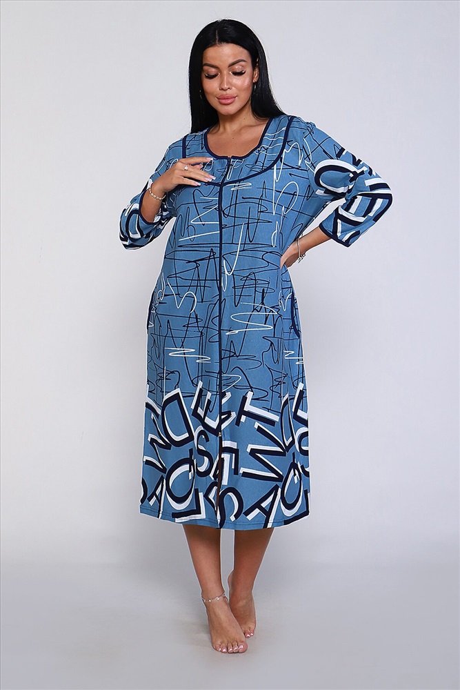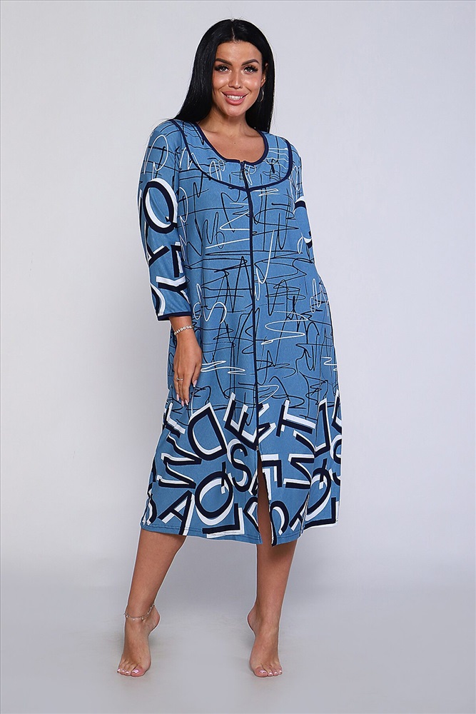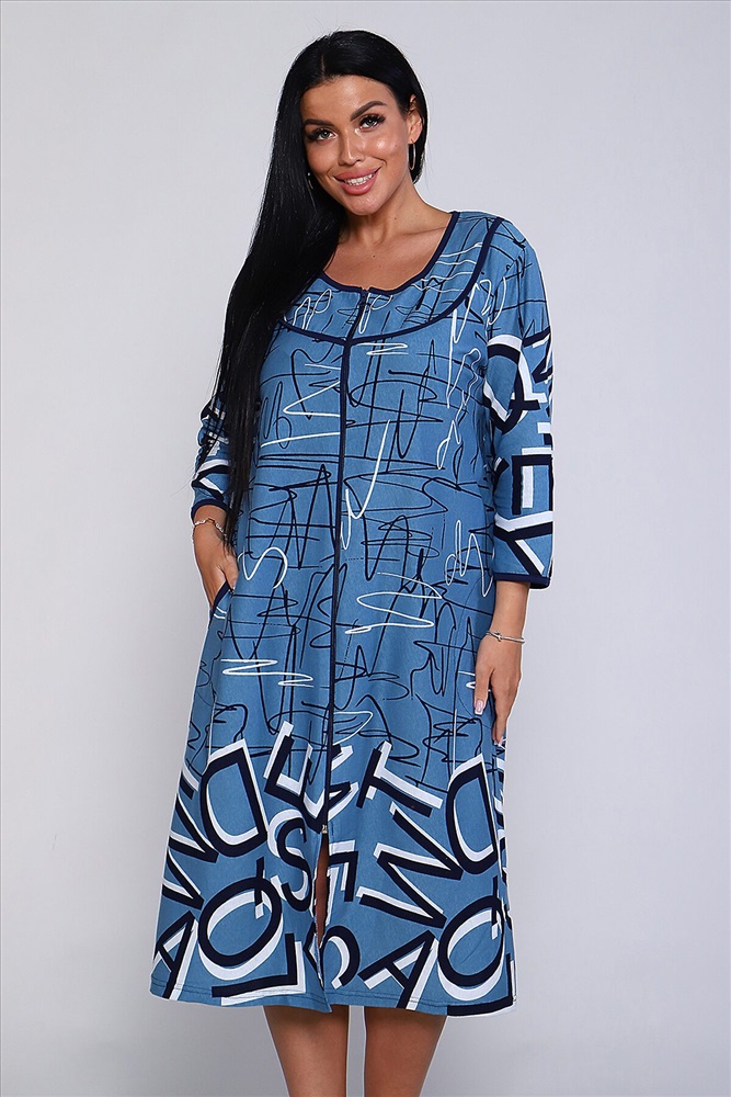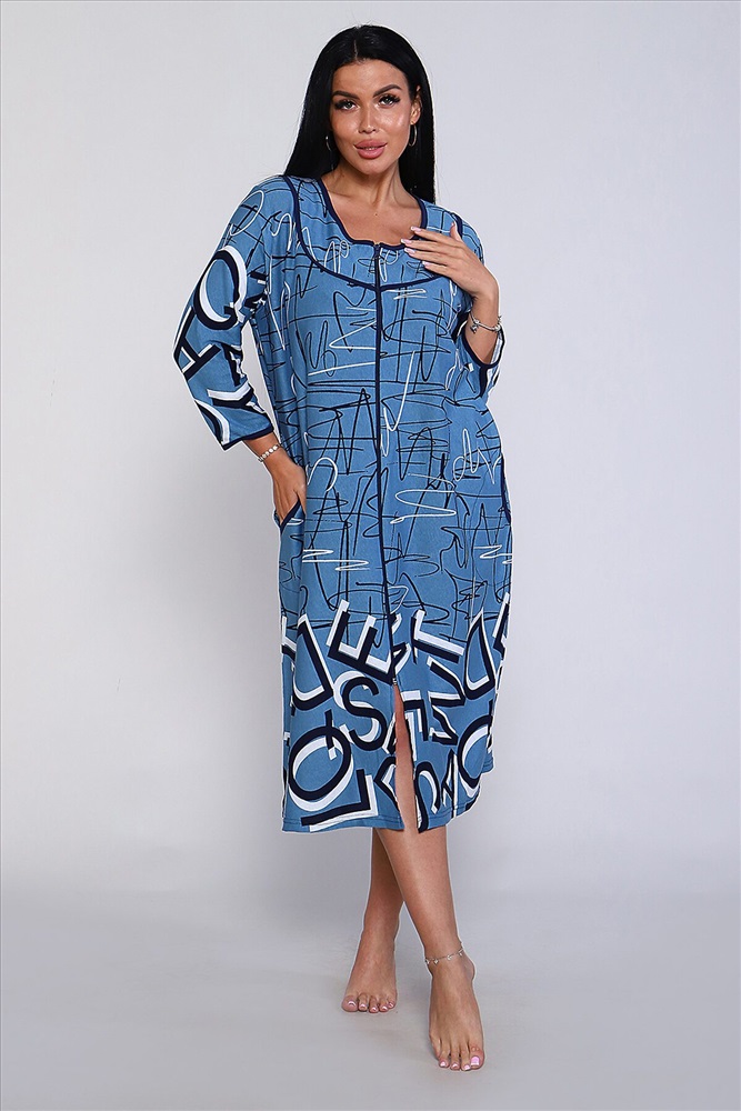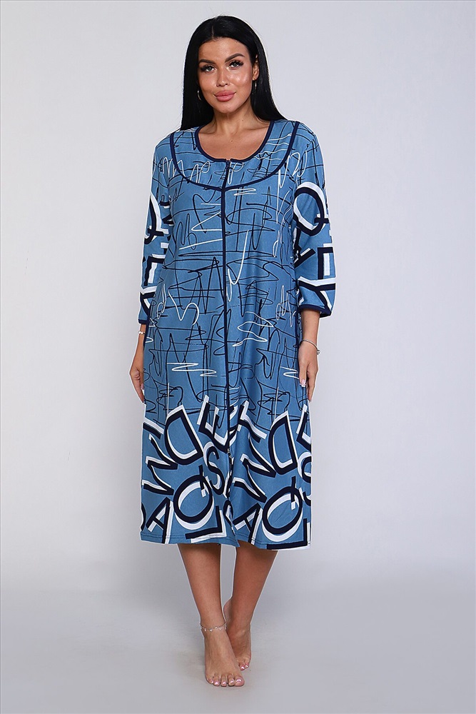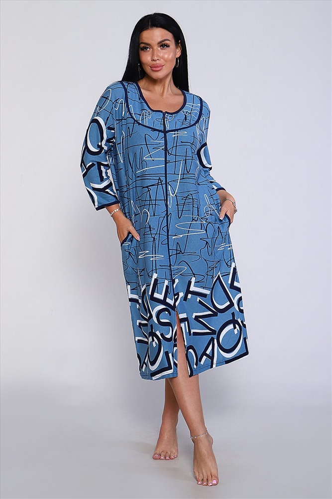 Страна производства: Россия Халат женский трикотажный свободного силуэта. Застегивается на молнию, имеет передние кокетки, отделан контрастным темным кантом, рукава втачные длиной 3/4, два боковых кармана.