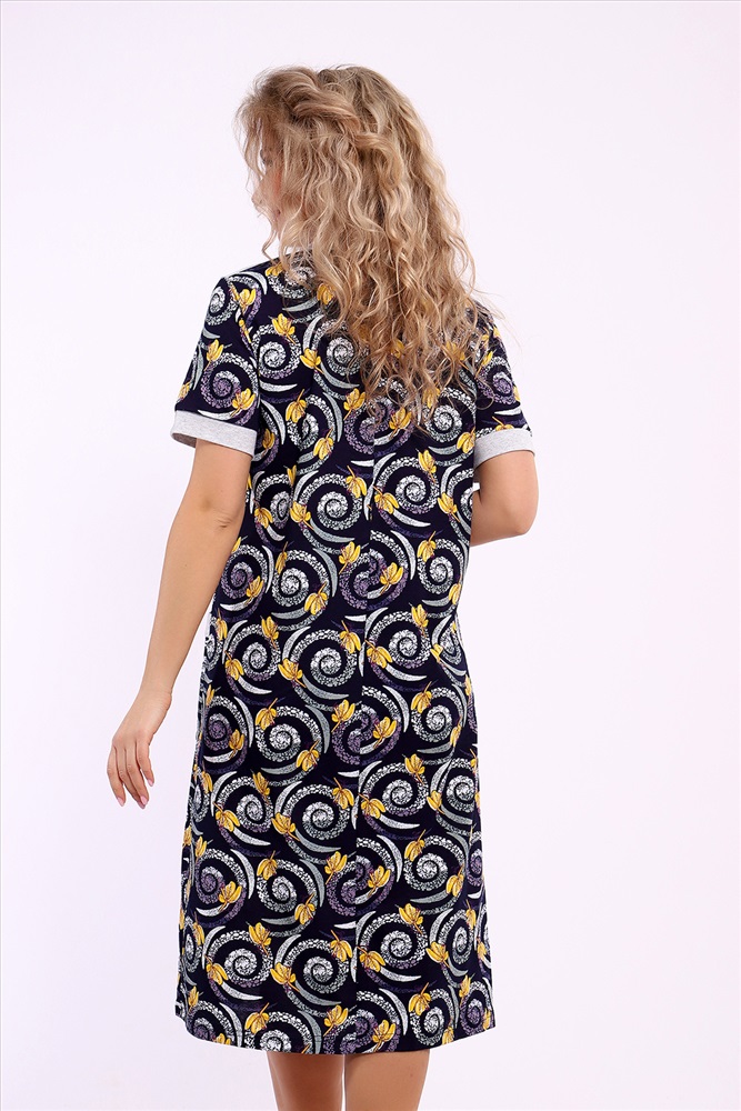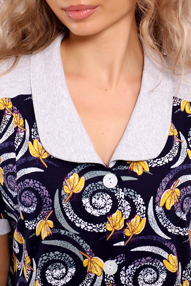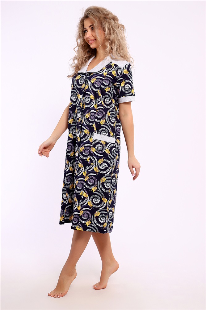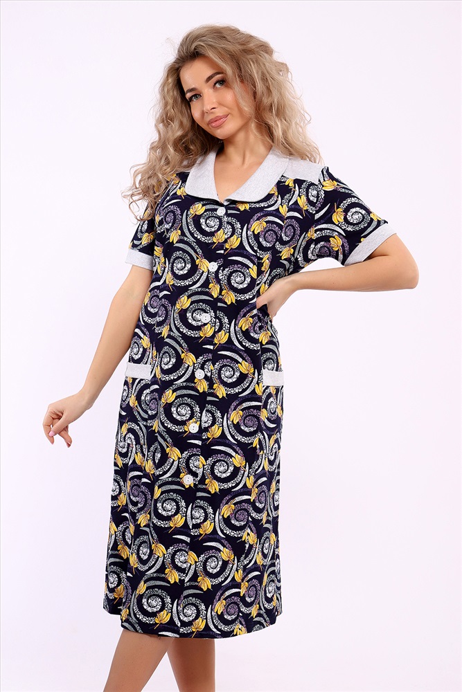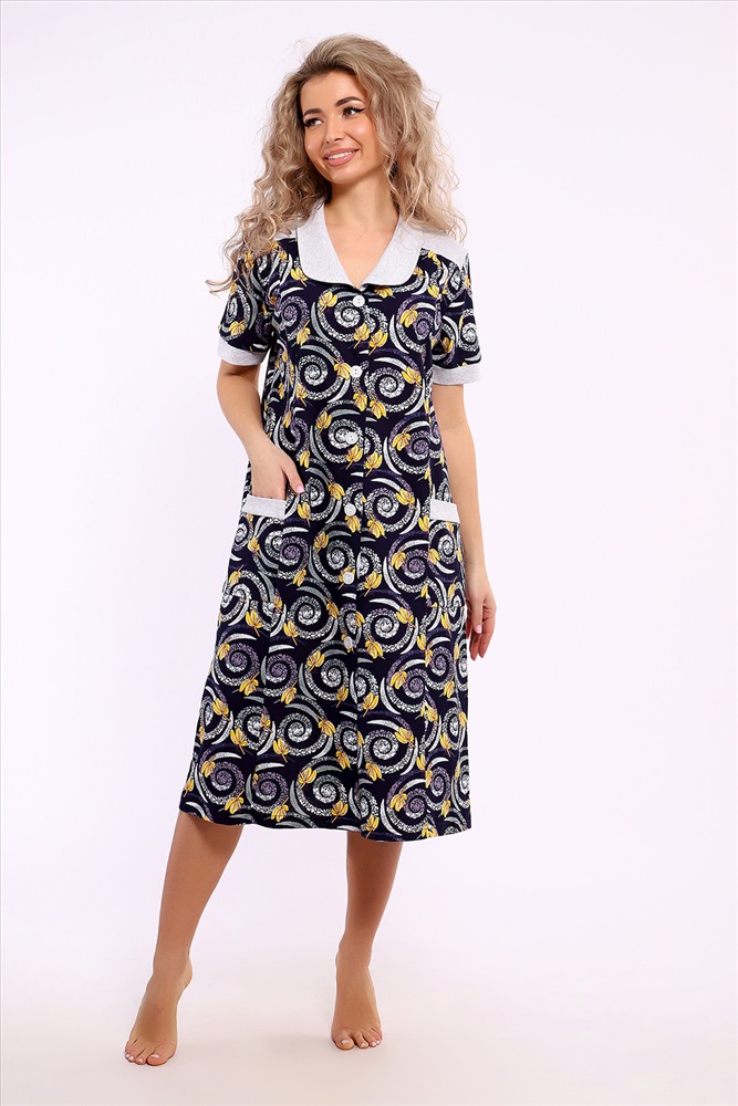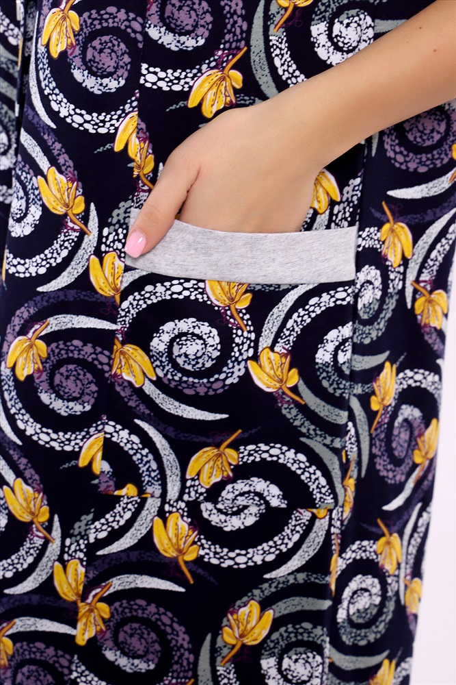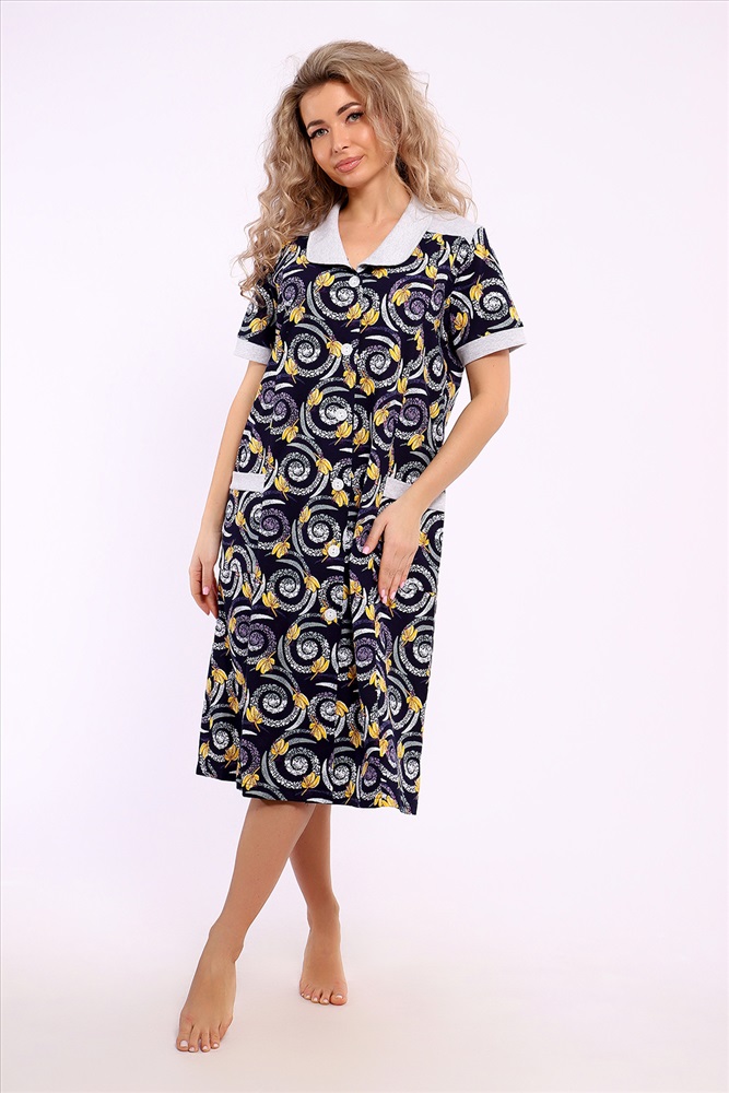 Застежка: пуговицы Халат домашний на пуговках, удлиненный, воротник из отделочной ткани. По полочке - рельефные швы, они обеспечивают удобство посадки. Имеются боковые карманы.