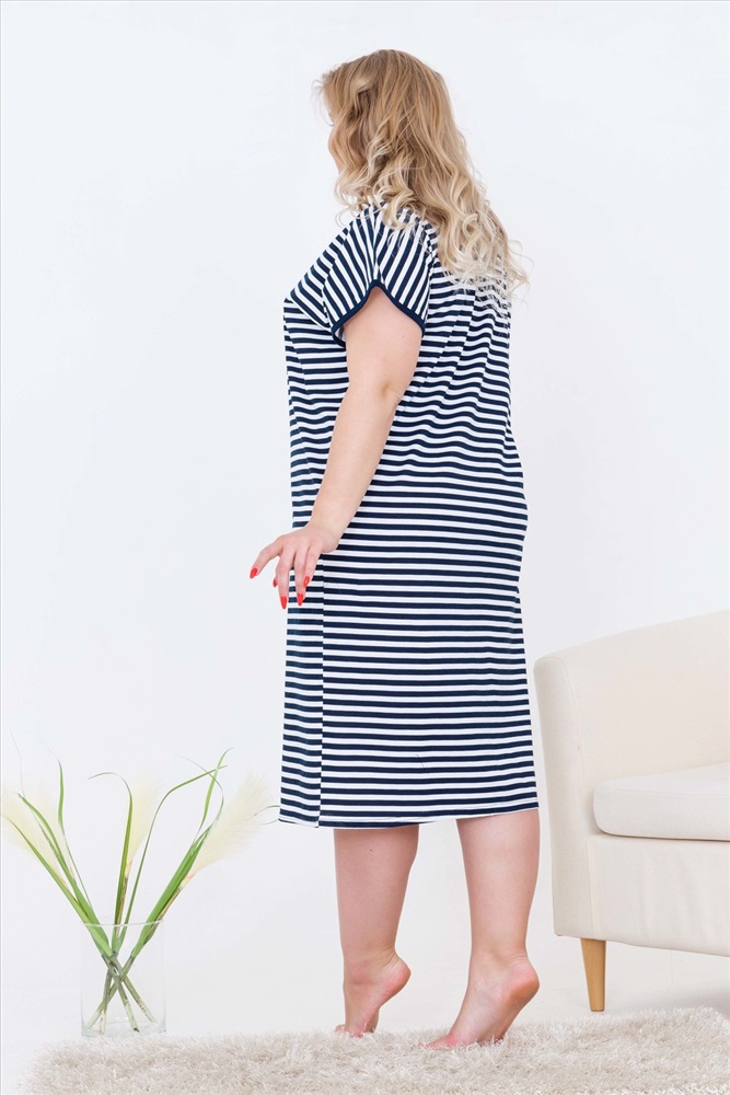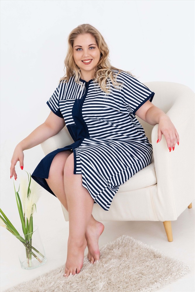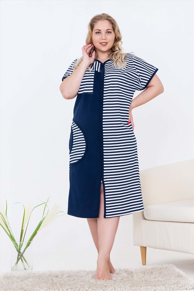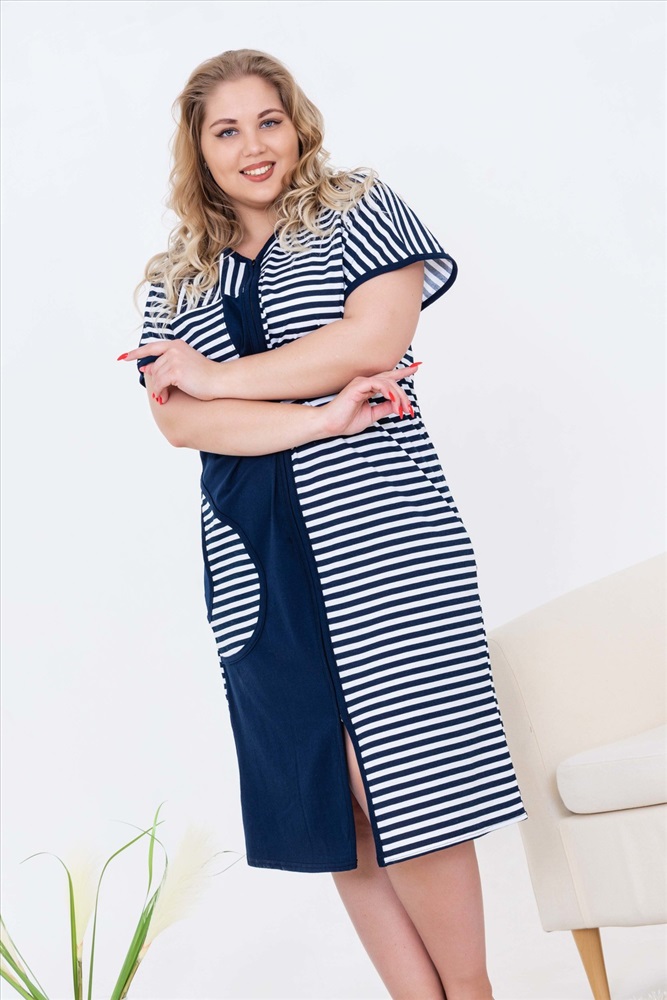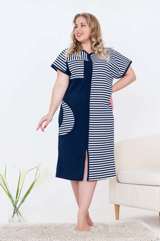 Застежка: молния Халат женский домашний, средней длины на молнии, с комфортной посадкой по фигуре. Украшением изделия служит комбинирование тканей: полоска и однотонная ткань. С одной стороны полочки - отрезная кокетка с накладным карманом вверху и внизу. Ткань изделия - кулирная гладь 100% хлопок.