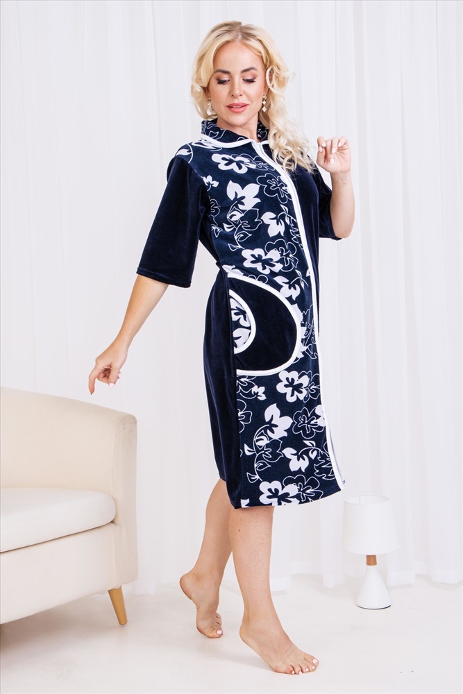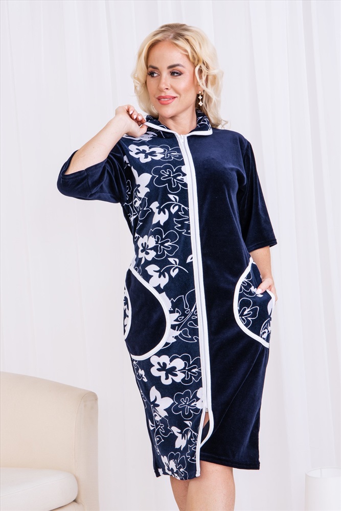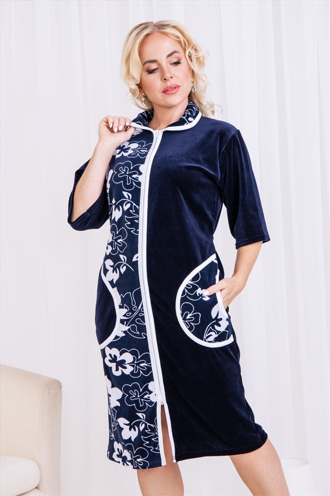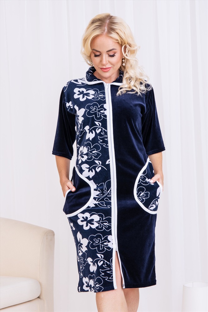 Состав: 80% хлопок, 20% п/э Модель: Халат 53511 Тип товара: халат Материал: велюр | велюр Бренд: Натали Суслова Карман: накладные Назначение: для дома НДС: Без НДС Отделка: с карманами Рисунок: цветы | узоры Рукав: рукав 3/4 Сезонность: лето | осень | весна | зима Силуэт: прямой Стиль: домашний Воротник: отложной воротник Застежка: молния Халат домашний женский на молнии. Рукав короткий, длина ниже колена, в боковых швах два полупояса, воротник круглый. Размерный ряд имеет большие размеры. Таблица размеров и веса
