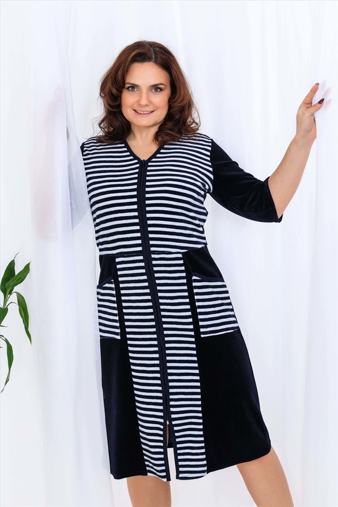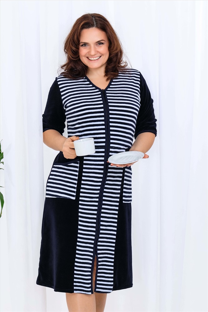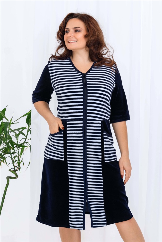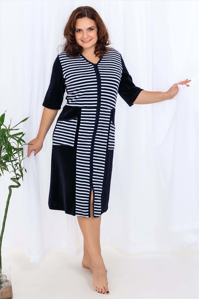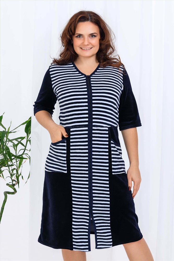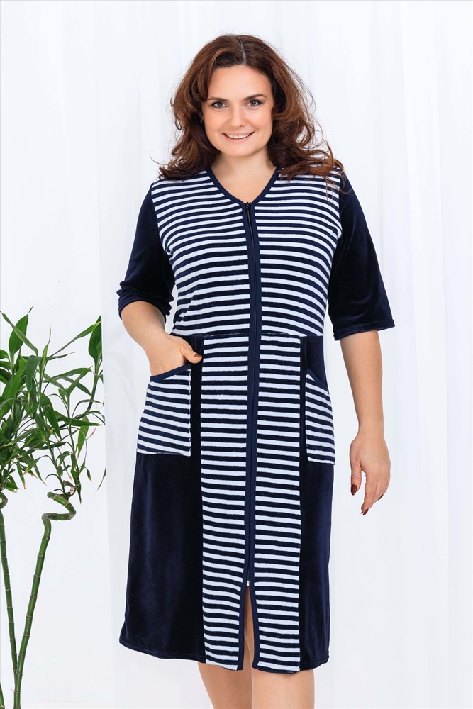 Состав: 80% хлопок, 20% ПЭ Модель: Халат 53516 Тип товара: халат Материал: велюр | велюр Бренд: Натали Суслова Длина: средняя длина Карман: накладные Назначение: для дома НДС: Без НДС Отделка: с карманами Рисунок: полоска Рукав: рукав 3/4 Сезонность: лето | осень | весна | зима Силуэт: полуприлегающий Стиль: домашний Воротник: без воротника Застежка: молния Халат женский из велюра, на молнии. Полочка отрезная по линии талии, в боковых швах два полупояса, рукав короткий. Размерный ряд имеет большие размеры. Ткань велюр - 80% хлопок, 20% полиэстер Таблица размеров и веса
