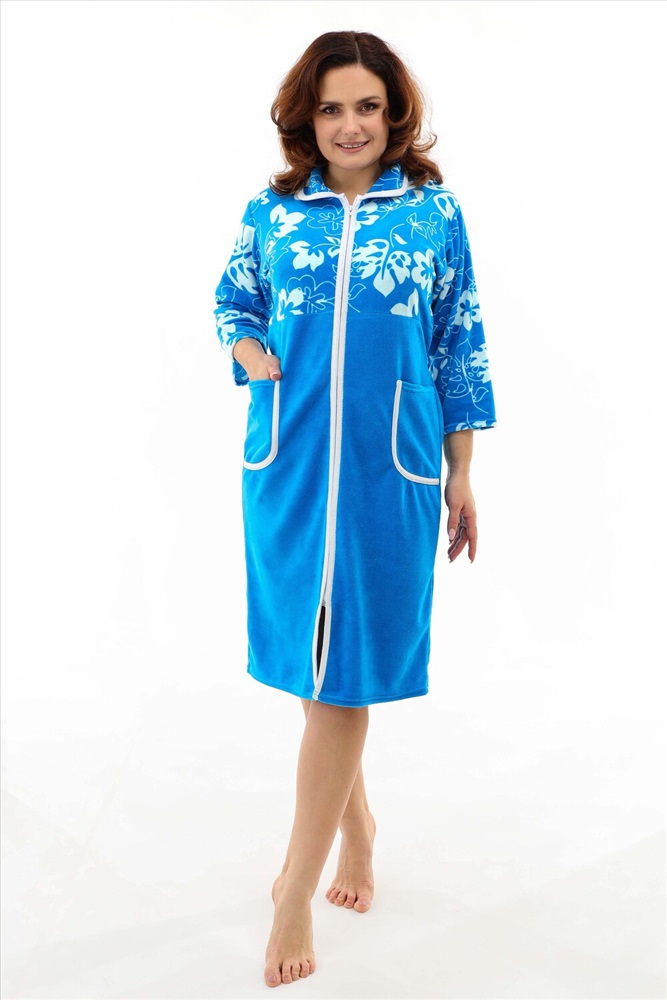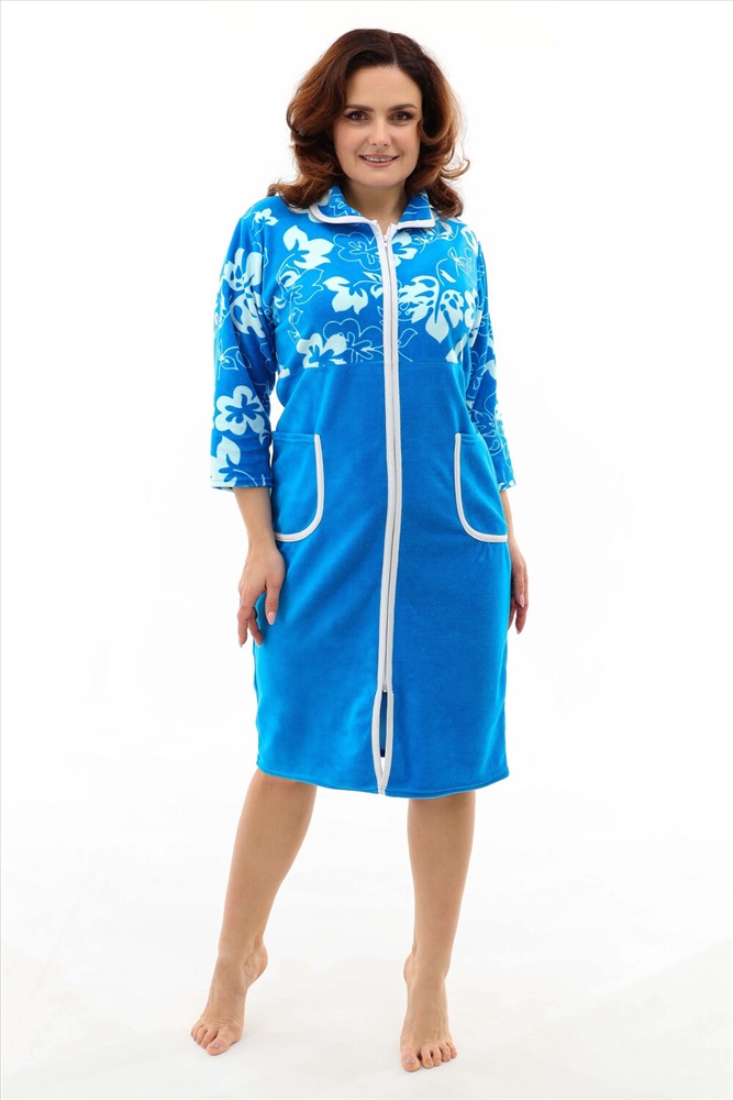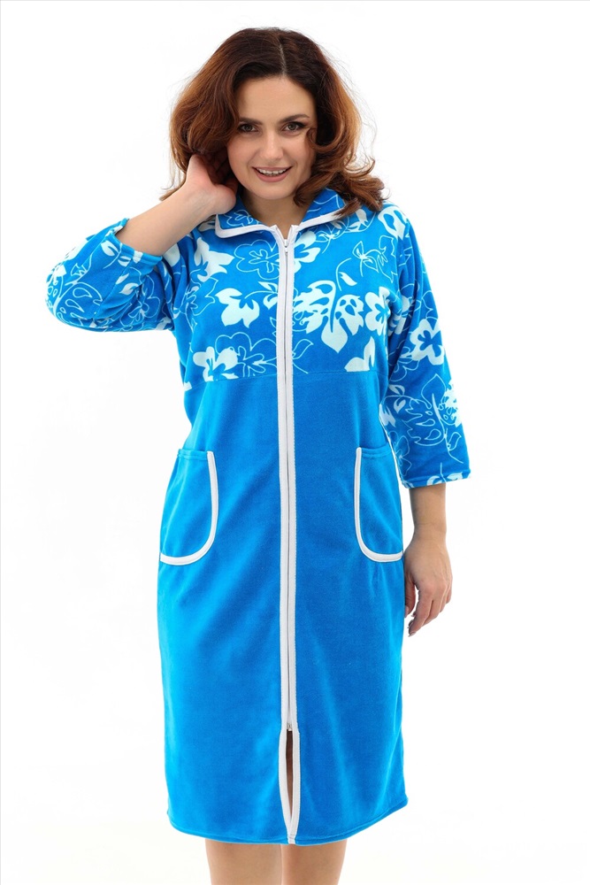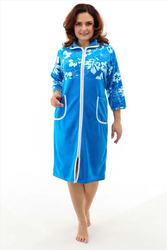 Застежка: молния Халат женский на молнии, воротник круглый, в боковых швах два полупояса, рукав длиной до локтя. В наличии есть большие размеры. Ткань велюр.
