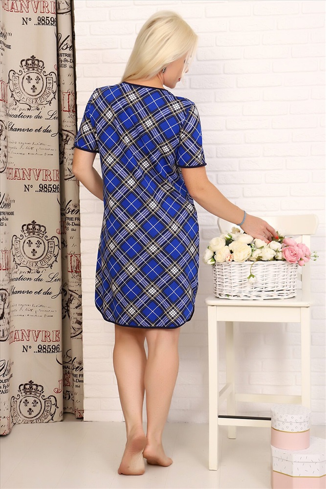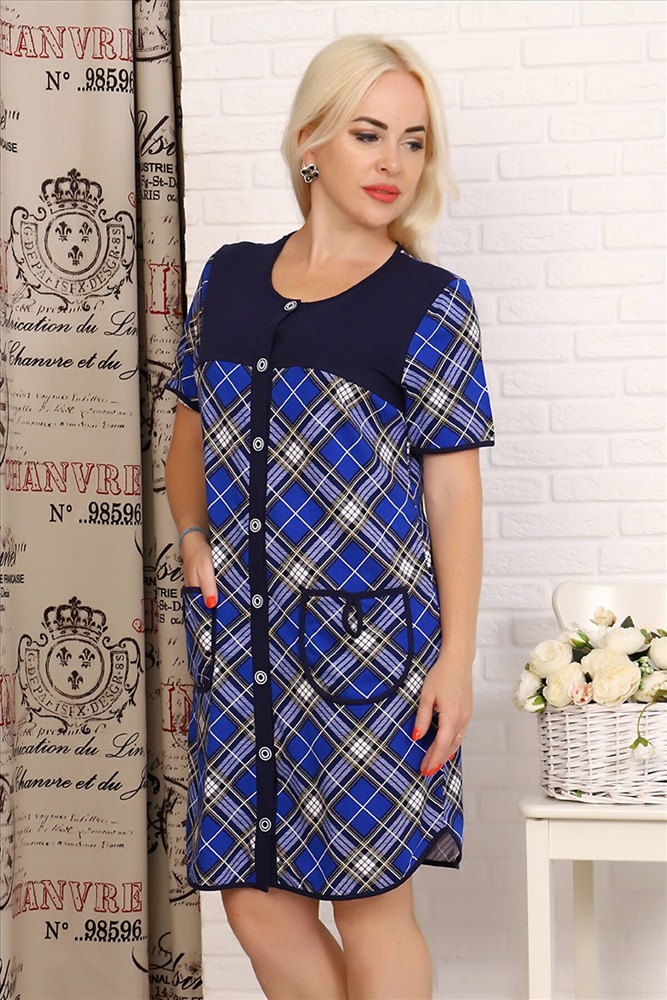 Халат женский слегка свободного покроя, с короткими рукавами. Сшит из кулирки. Застежка на пуговицах. Горловина округлой формы, рукава, карманы и подол халата обработаны отделочной бейкой. Длина халата чуть ниже колен.