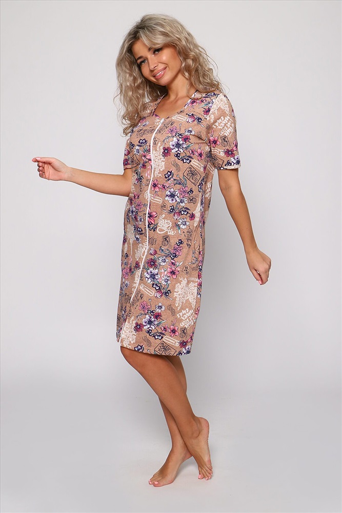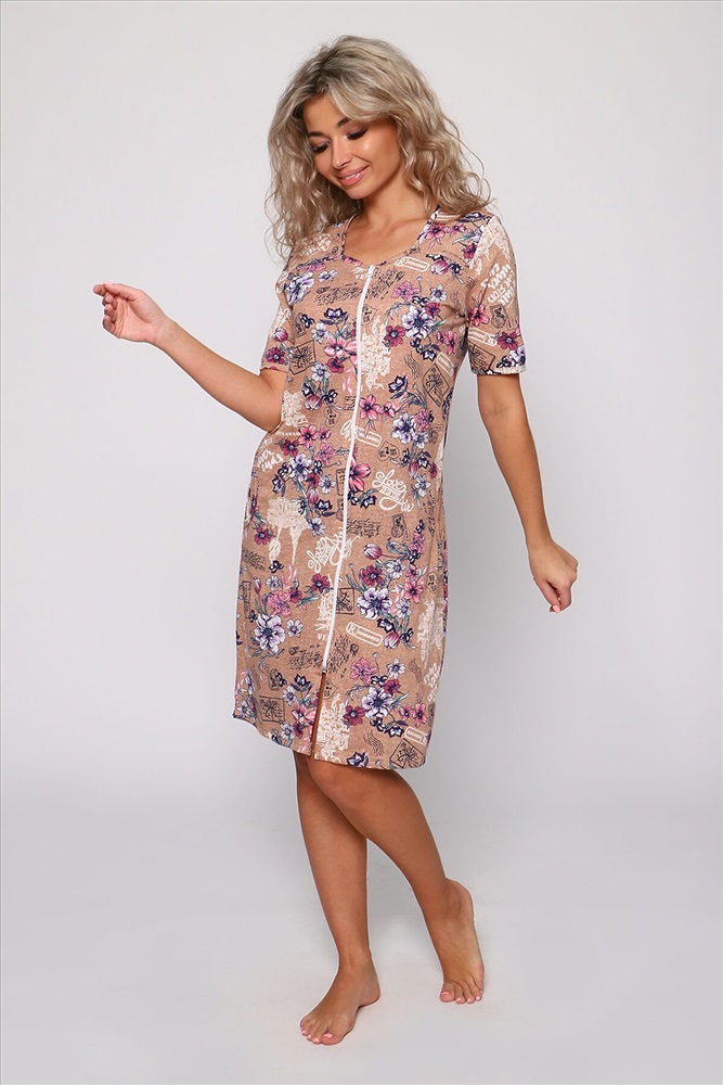 ID товара: 886569 Состав: 100% Хлопок Сезон: Весна/Лето Фасон: Прямой Рукав: Короткие Вид застежки: Молния Основная ткань: Хлопок | Кулирка Стиль: Повседневный Страна бренда: Россия Страна производства: Россия Халат на молнии с короткими рукавами и карманами в боковых швах. Полочка с отрезными кокетками и квадратным вырезом горловины. Комфортен для повседневной носки. Комментарии к товару