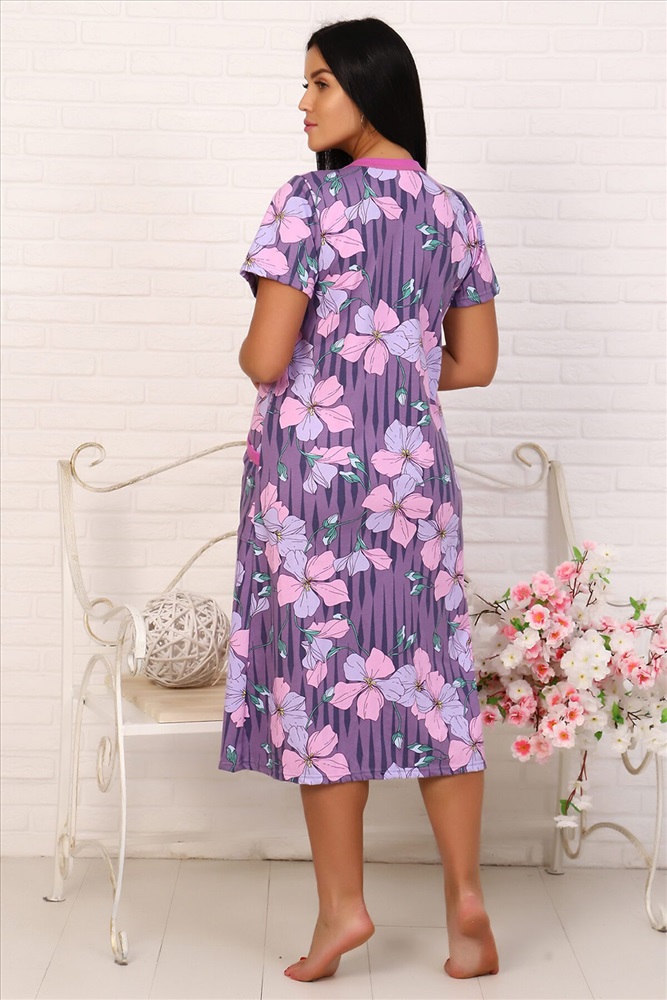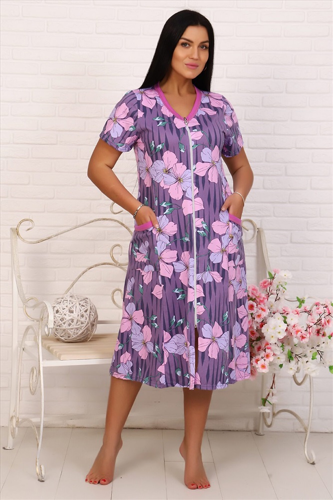 Страна производства: Россия Халат женский из кулирки с нежно-сиреневым рисунком. Короткий рукав. Горловина и карманы - однотонная отделка кантом
