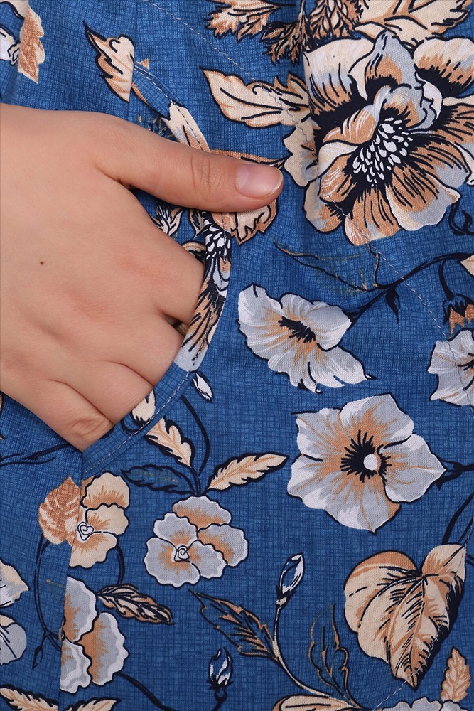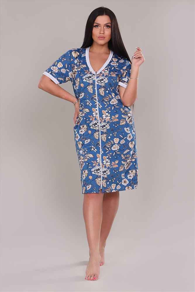 Халат женский оригинальной и очень красивой расцветки выполнен из ткани хлопок. Горловина и рукав обработаны широким кантом контрастного цвета. Халат на молнии, по бокам разрезы. Модель очень легкая, приятная к телу, подойдет для дома и отдыха.
