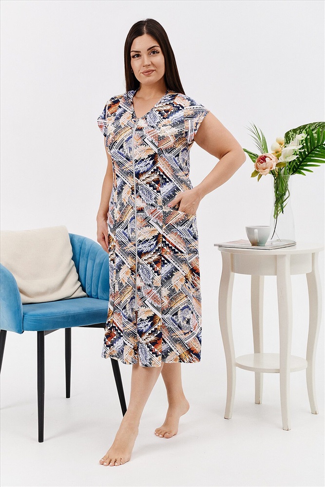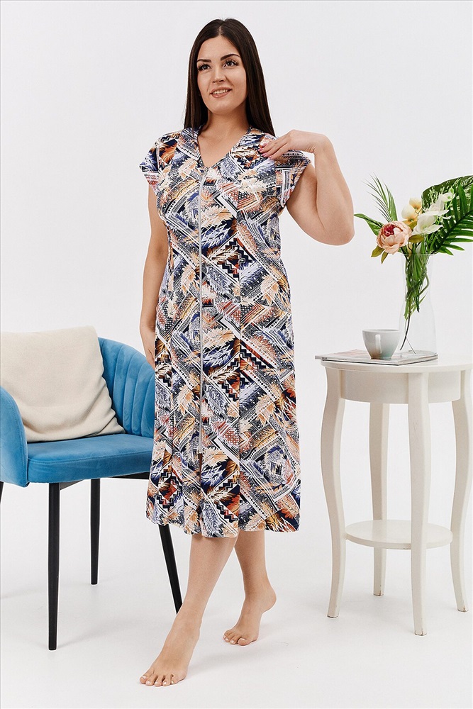 Страна производства: Россия Халат женский оригинальной летней расцветки, выполнен из 100% хлопка. Горловина имеет V-образный вырез, рукав короткий. Халат на серебристой молнии средней длины. Модель очень лёгкая, подойдёт для повседневной носки и отдыха.