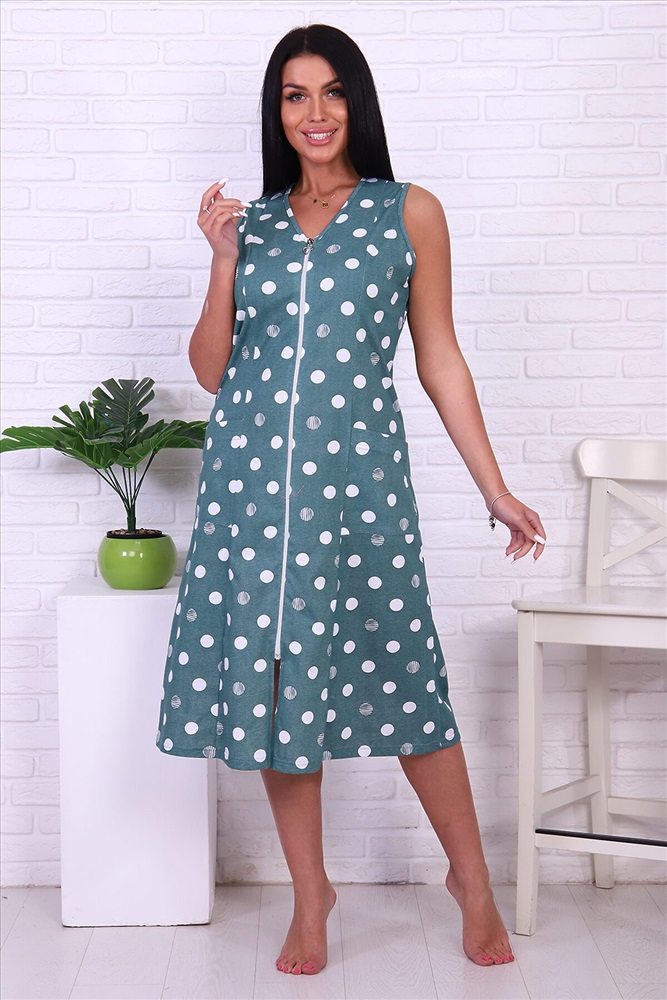 ID товара: 785999 Состав: 100% Хлопок Сезон: Демисезон Длина: Ниже колена Фасон: Расклешенный Рукав: Без рукавов Вид застежки: Молния Декоративные элементы: Принт Основная ткань: Хлопок | Кулирка Стиль: Повседневный Страна бренда: Россия Страна производства: Россия Халат женский на молнии, без рукава, с карманами. Ткань 100% хлопок кулирка расцветка "горох". Для дома и отдыха. Халат легкий, удобный и комфортный. Сохраняет форму и цвет после носки. Комментарии к товару