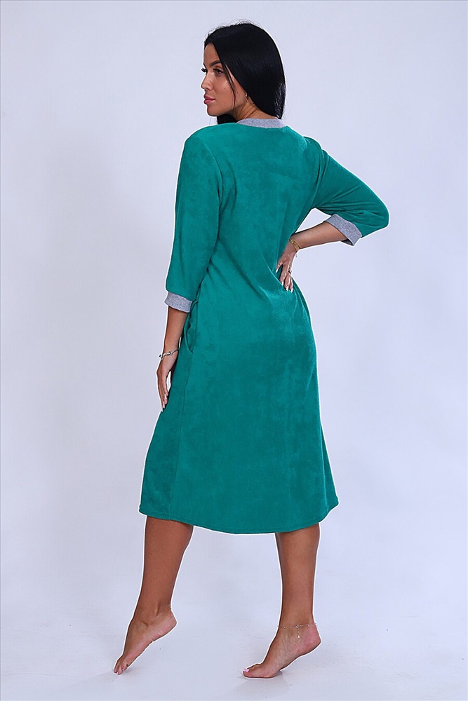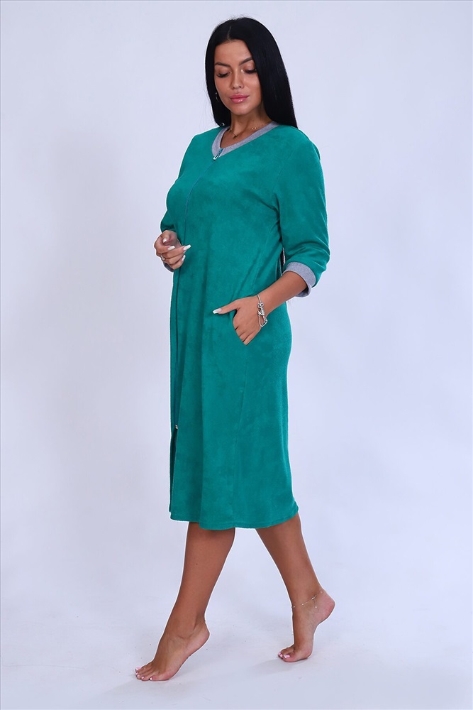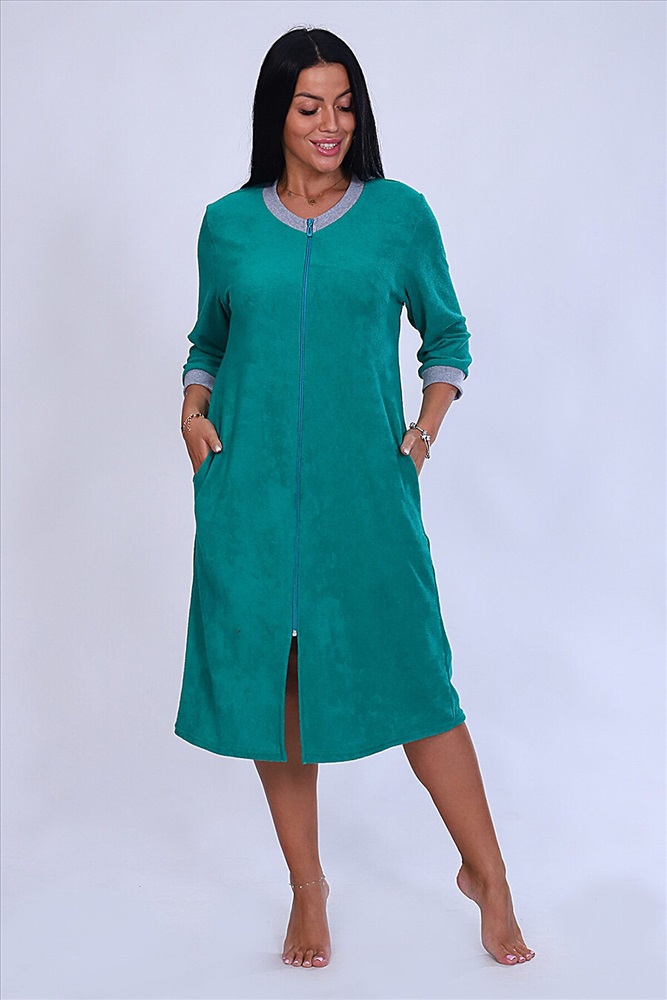 ID товара: 807785 Состав: 100% Хлопок Сезон: Демисезон Длина: Ниже колена Фасон: Полуприлегающий Рукав: 3/4 Вид застежки: Молния Основная ткань: Хлопок | Махра Стиль: Повседневный Страна бренда: Россия Страна производства: Россия Халат женский из ткани махра хлопок 100%. Халат на молнии, с карманами, рукав 3/4, рукава и горловина отделаны рибаной меланжевого цвета. Вырез горловины V образный, покрой прямого силуэта. Халат предназначен для дома и отдыха. Комментарии к товару