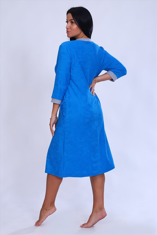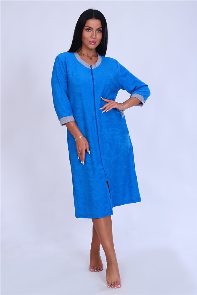 Халат женский из ткани махра хлопок 100%. Халат на молнии, с карманами, рукав 3/4, рукава и горловина отделаны рибаной меланжевого цвета. Вырез горловины V образный, покрой прямого силуэта. Халат предназначен для дома и отдыха.