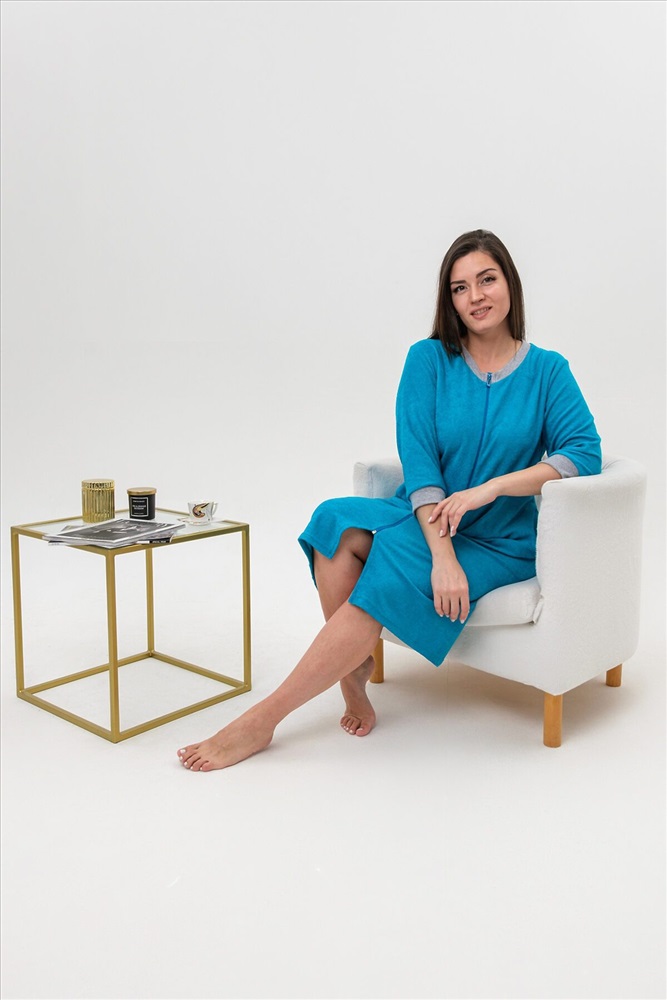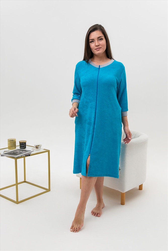 ID товара: 817111 Состав: 100% Хлопок Сезон: Демисезон Длина: Ниже колена Фасон: Полуприлегающий Рукав: 3/4 Вид застежки: Молния Основная ткань: Хлопок | Махра Стиль: Повседневный Страна бренда: Россия Страна производства: Россия Халат женский из ткани махра хлопок 100%. Халат на молнии, с карманами, рукав 3/4, рукава и горловина отделаны рибаной меланжевого цвета. Вырез горловины V образный, покрой прямого силуэта. Халат предназначен для дома и отдыха. Комментарии к товару