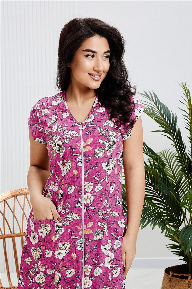 Страна производства: Россия Халат женский на молнии оригинальной расцветки с коротким рукавом выполнен из 100% хлопка. Горловина имеет V-образный вырез, обработана узким кантом, рукава и карманы подшиты. Модель очень легкая, идеально подойдет для повседневной носки и отдыха.