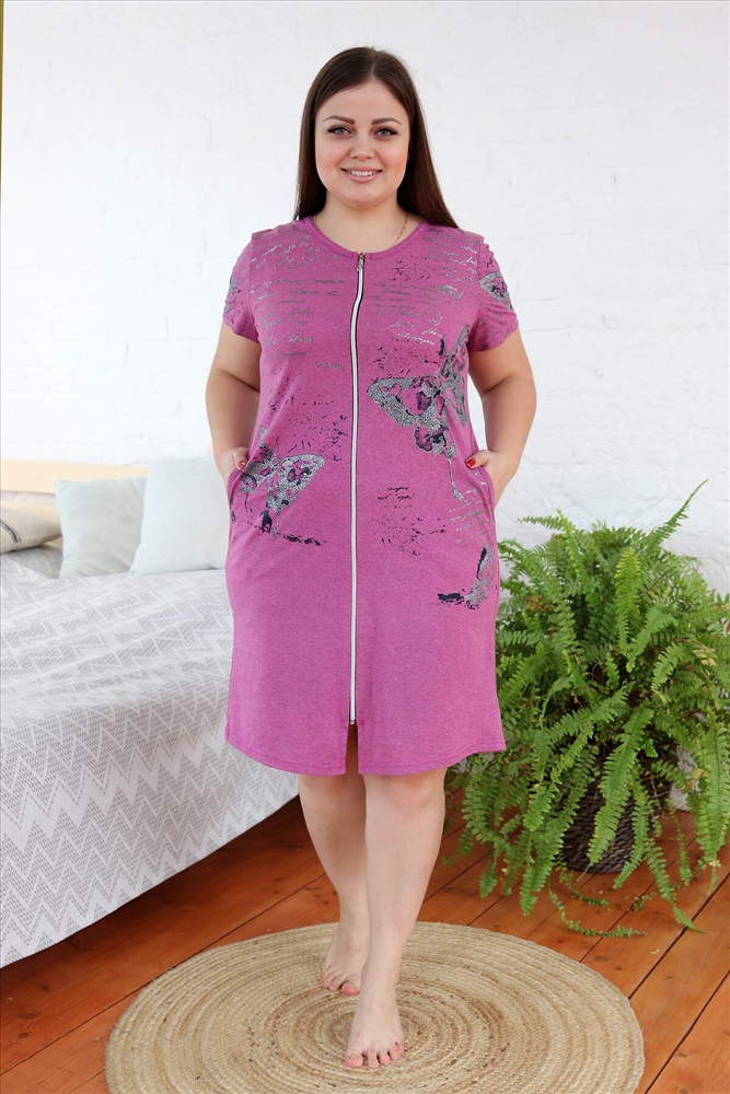 ID товара: 760105 Состав: Хлопок 70%, Полиэстер 30% Сезон: Демисезон Длина: прикрывает колено Фасон: Полуприлегающий Рукав: Короткие Вид застежки: Молния Декоративные элементы: Принт Основная ткань: Хлопок | Кулирка Стиль: Повседневный Страна бренда: Россия Страна производства: Россия Халат женский полуприлегающего силуэта. Рукав втачной короткий. Вырез Y-образный. На полочках внутренние карманы. Оригинальный принт с бабочками на полочках и рукавах. На модели 52 размер Комментарии к товару