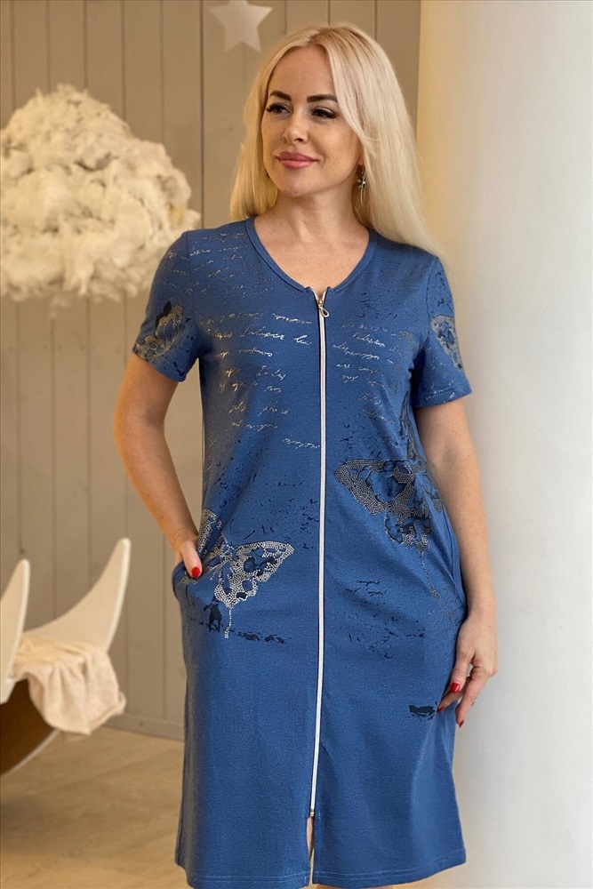 ID товара: 760106 Состав: Хлопок 70%, Полиэстер 30% Сезон: Демисезон Длина: Ниже колена Фасон: Полуприлегающий Вид застежки: Молния Декоративные элементы: Принт Основная ткань: Хлопок | Кулирка Стиль: Повседневный Страна бренда: Россия Страна производства: Россия Халат женский полуприлегающего силуэта. Рукав втачной короткий. Вырез Y-образный. На полочках внутренние карманы. Оригинальный принт с бабочками на полочках и рукавах. На модели 52 размер Комментарии к товару