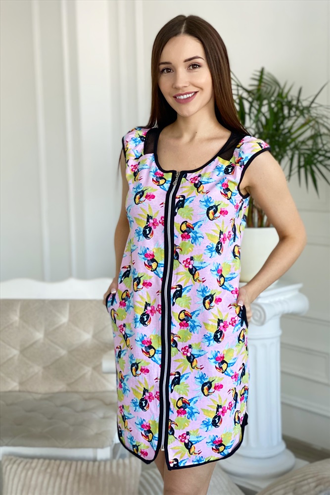 Состав: 100% хлопок Модель: Халат 8048 Тип товара: халат Материал: кулирка | кулирка Бренд: Натали Суслова Длина: короткий Карман: боковые Назначение: для дома НДС: 22% Отделка: с карманами | с сеткой Рейтинг: Рейтинг 4 и выше Рисунок: зверюшки Рукав: без рукава Сезонность: лето | осень | весна | зима Силуэт: полуприлегающий Стиль: домашний Воротник: без воротника Застежка: молния Халат на молнии, полуприлегающего силуэта, длиной выше колена, с округлой горловиной, с боковыми карманами, c фигурным низом. Рукав-крыло со вставкой из сетки. Горловина, пройма, борта и низ изделия обработаны бейкой из отделочного полотна. Таблица размеров и веса
