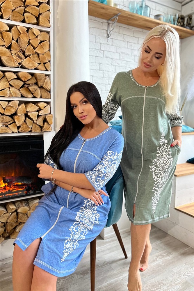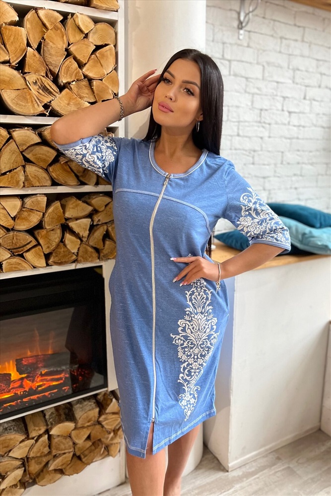 ID товара: 744991 Состав: Хлопок 100% Сезон: Демисезон Длина: Ниже колена Фасон: Полуприлегающий Рукав: 3/4 Вид застежки: Молния Декоративные элементы: Принт Основная ткань: Хлопок | Кулирка Стиль: Повседневный Страна бренда: Россия Страна производства: Россия Халат на молнии, полуприлегающего силуэта, длиной ниже колена, с округлой горловиной, с карманами в боковом шве. Рукав втачной, длиной 3/4. В верхней части полочки и спинки расположены фигурные кокетки. Горловина и низ рукавов обработаны бейкой из основного полотна. Комментарии к товару