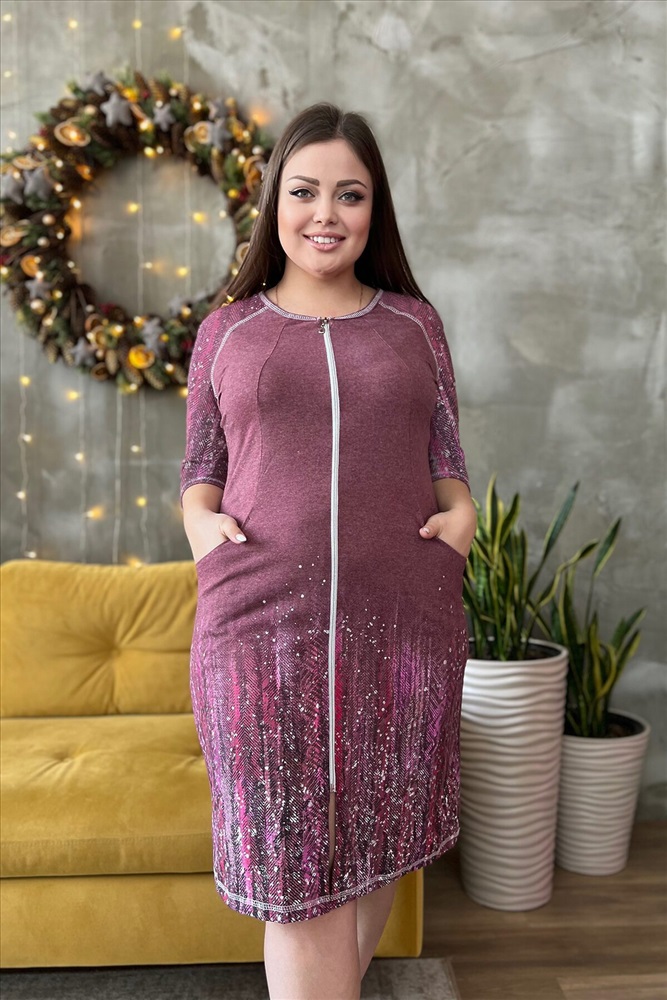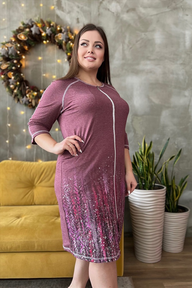 Халат полуприлегающего силуэта, средней длины, с округлой горловиной. Рукав реглан, длиной 3/4. Обработаны карманы в рельефах полочки. Горловина обработана бейкой. На модели 52 размер. Обратите внимание на разные варианты печати
