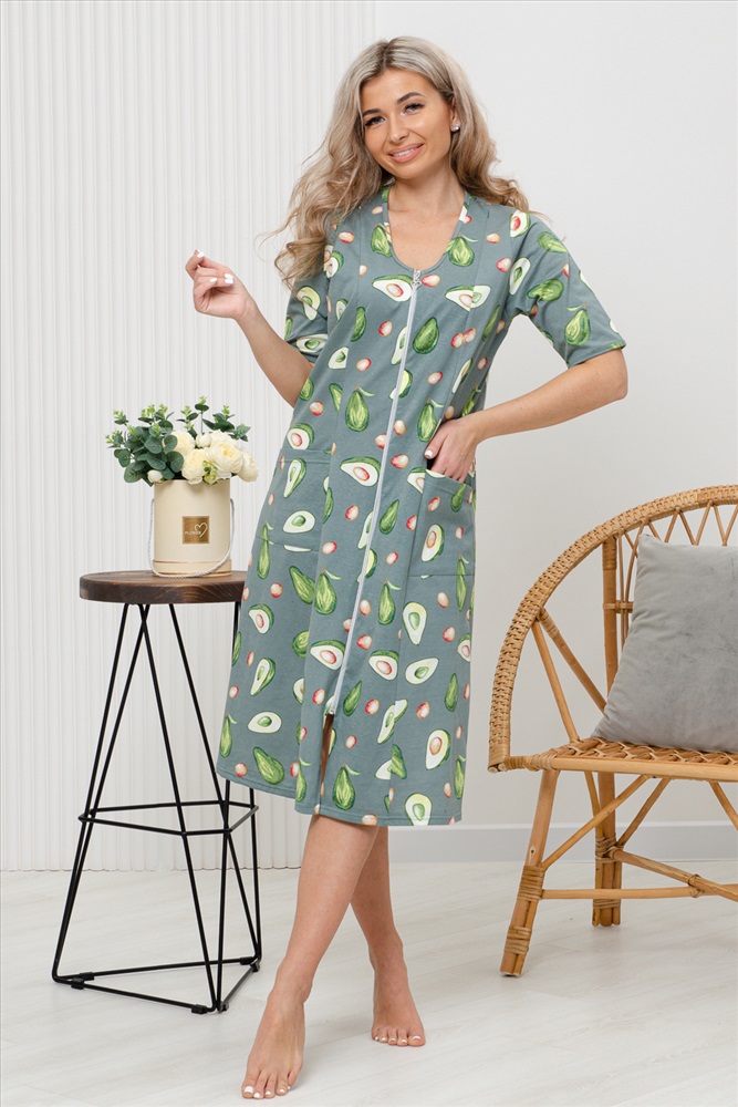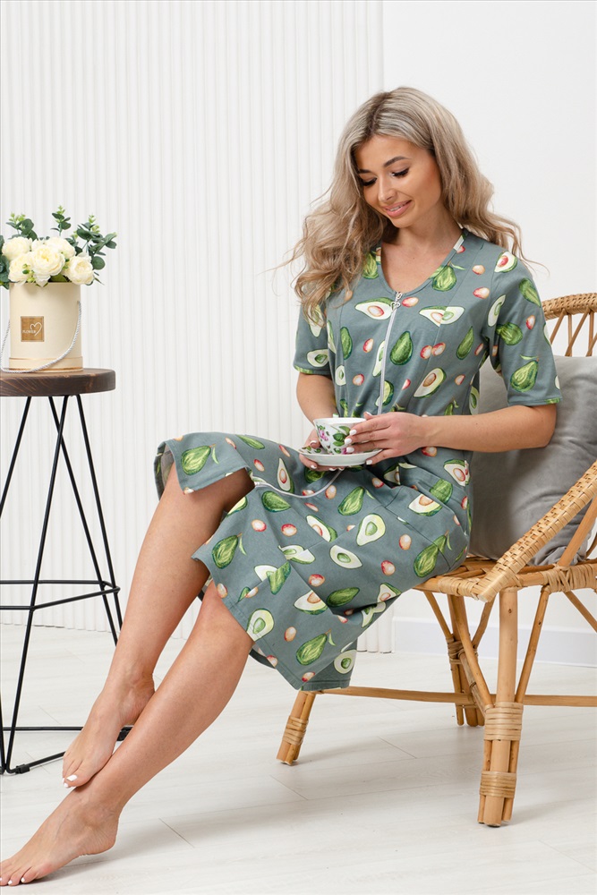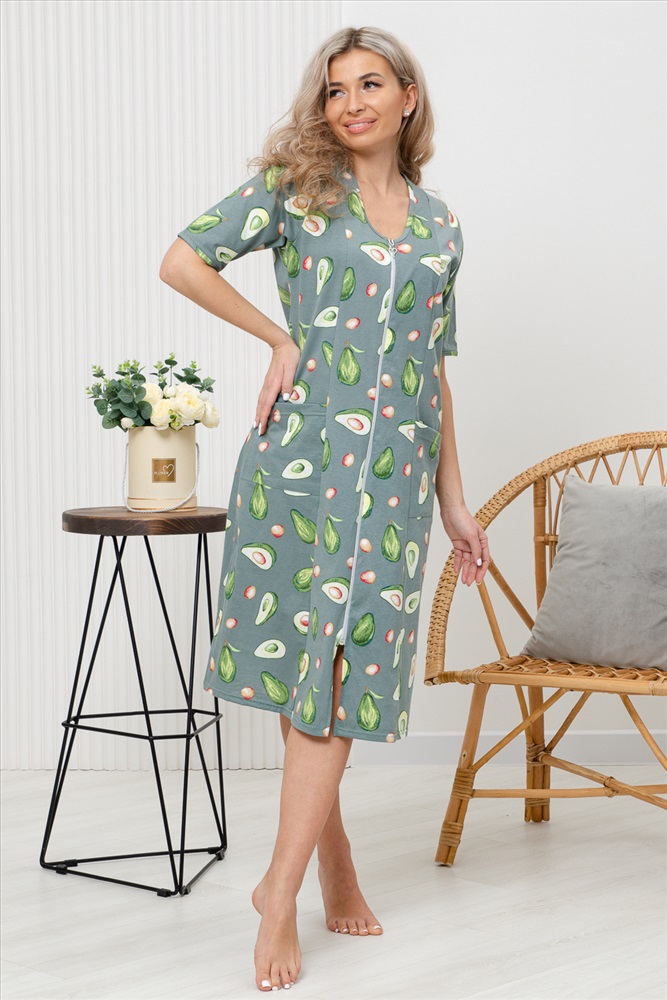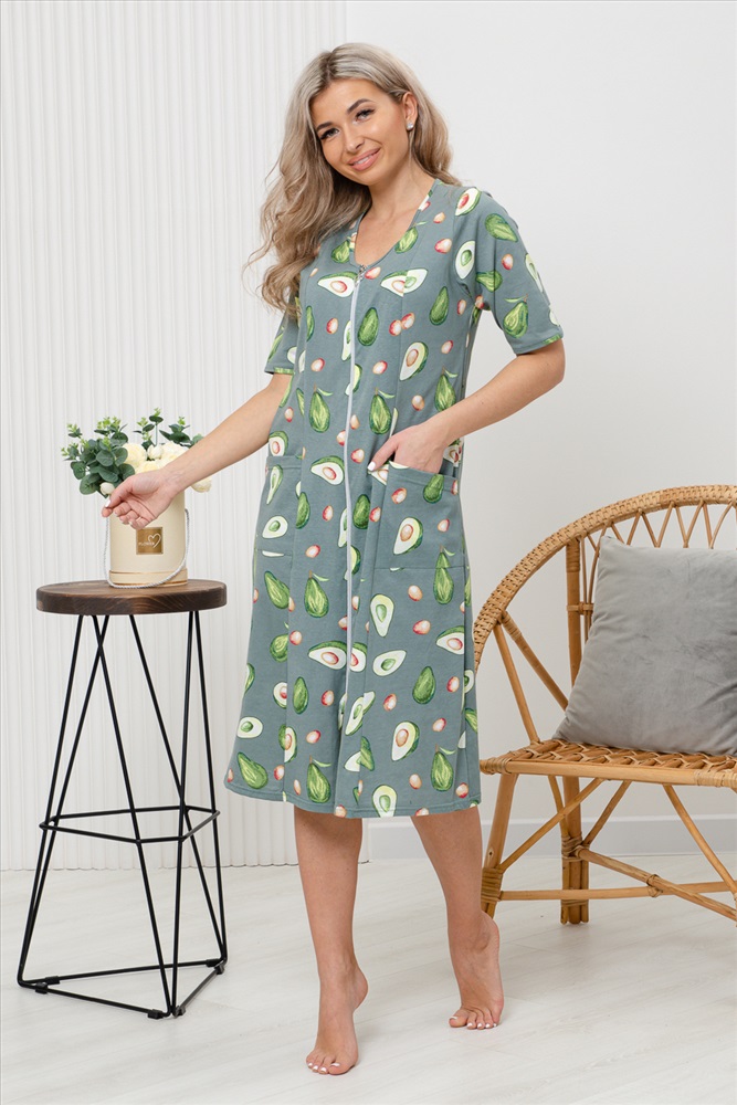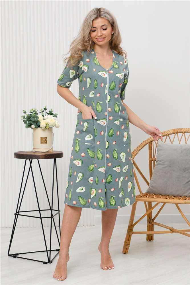 Состав: 100% хлопок Модель: Халат 83609 Тип товара: халат Материал: кулирка | кулирка Бренд: Натали Суслова Карман: накладные Назначение: для дома НДС: Без НДС Отделка: с карманами Рисунок: фуд-принт | цветы Рукав: короткий рукав Сезонность: лето | осень | весна | зима Силуэт: свободный Стиль: домашний Воротник: без воротника Застежка: молния Халат женский оригинальной расцветки выполнен из 100% хлопка. Горловина имеет V-образный вырез, рукав короткий. Халат на молнии средней длины. подойдет для повседневной носки и отдыха. Таблица размеров и веса