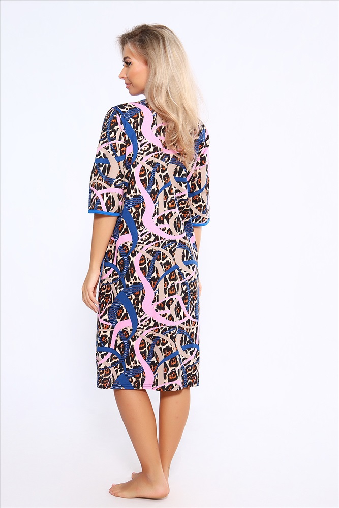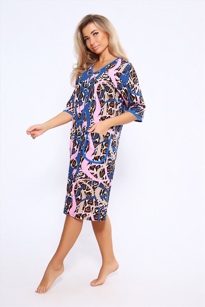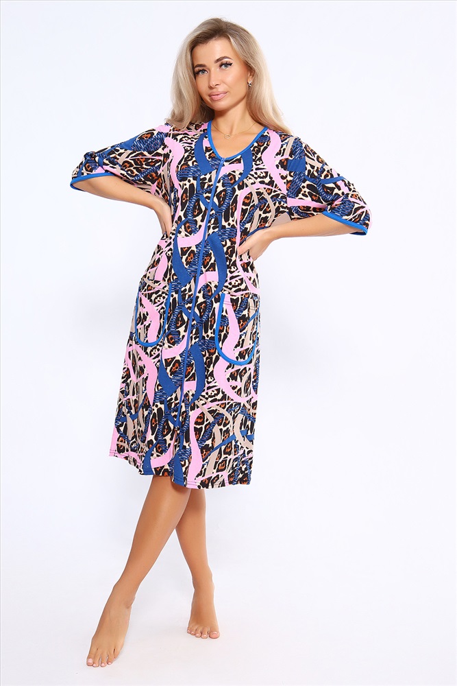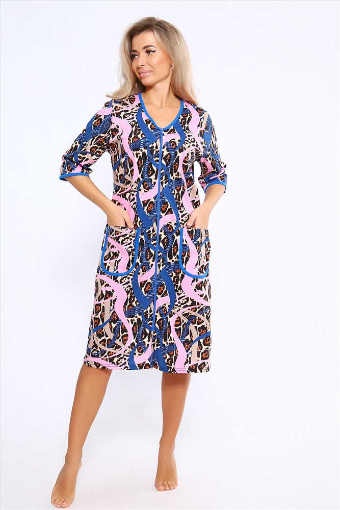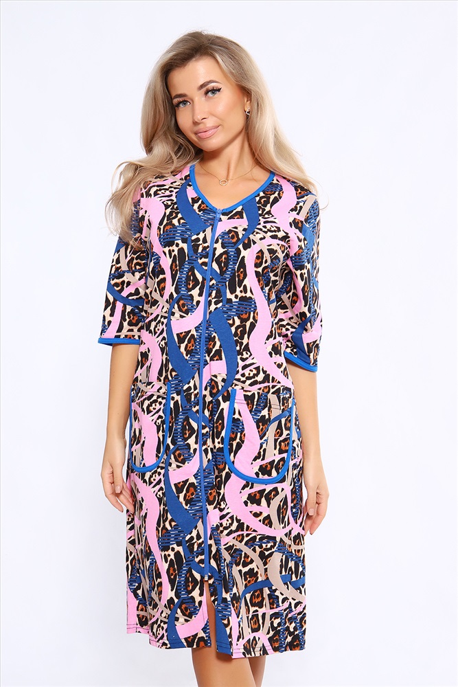 Застежка: молния Красивый женский халат на молнии. Рукав 3/4. Горловина, рукава и накладные карманы обработаны бейкой из отделочной ткани. Халат прекрасно подойдет для дома, дачи и отдыха.