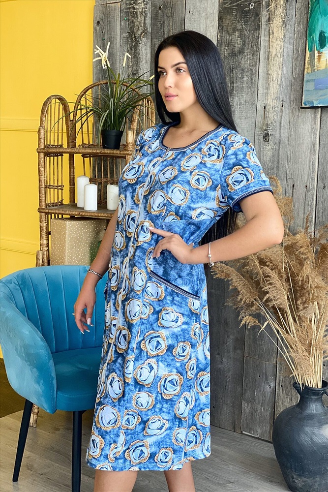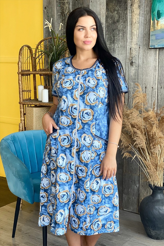 Страна производства: Россия Халат женский полуприлегающего силуэта. Застежка - молния. Вырез круглый. Рукав втачной короткий на манжете. На полочке и спинке рельефы. Средние части полочки и спинки, манжеты рукава из отделочной однотонной ткани.