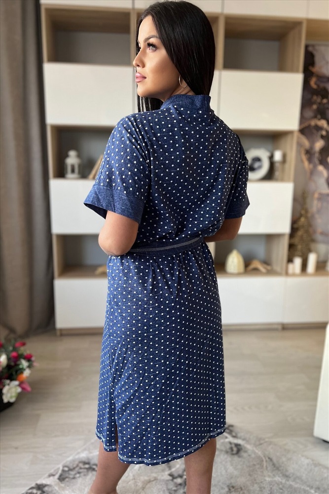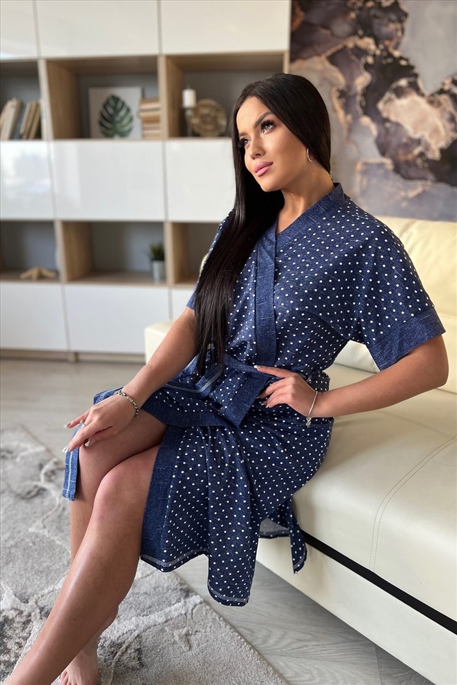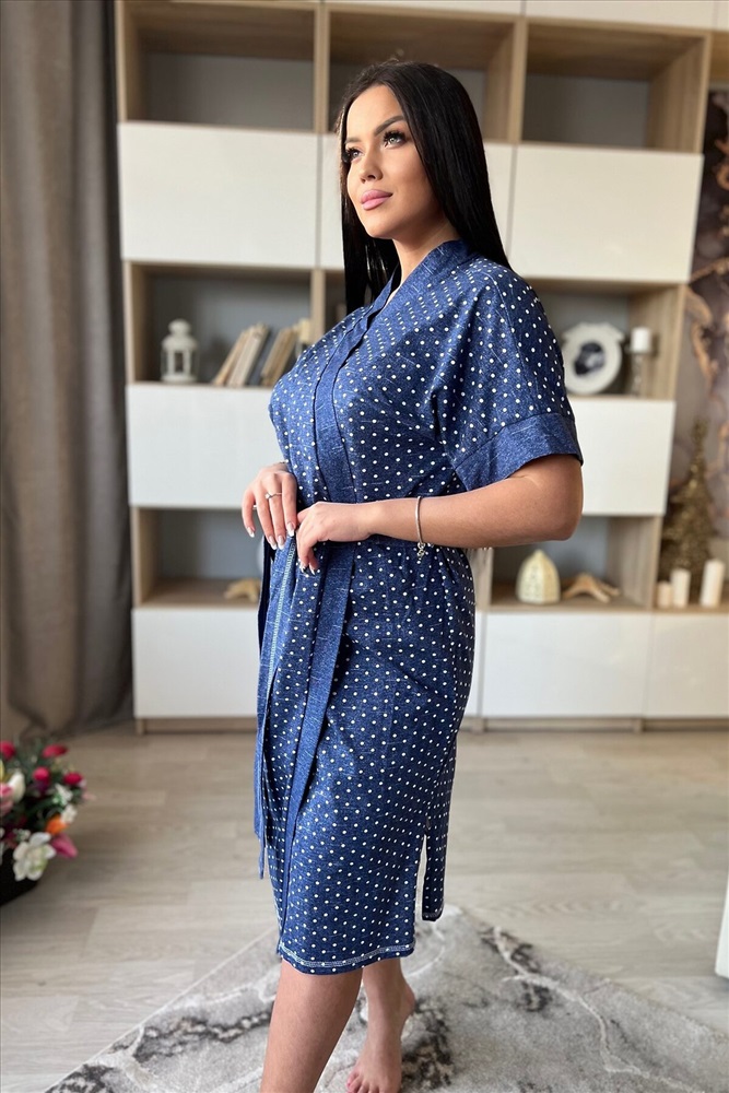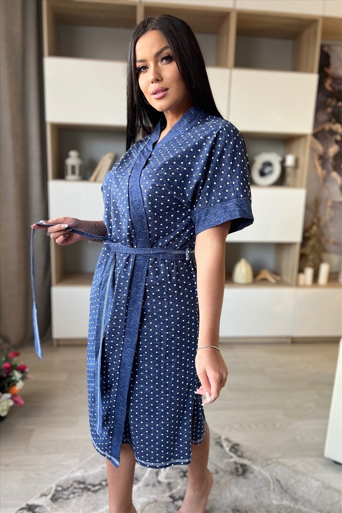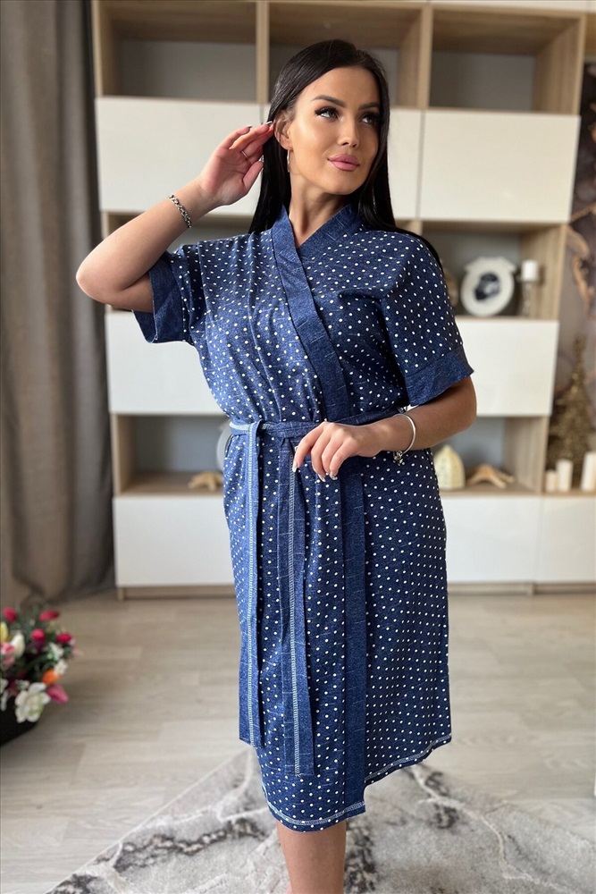 Страна производства: Россия Халат женский домашний с запахом. Рукав цельнокроенный до локтя. Обтачка борта, манжета рукава и пояс из отделочной ткани.