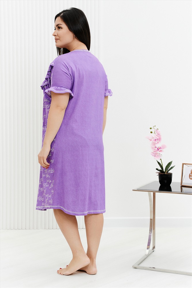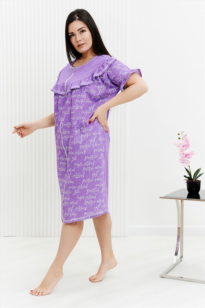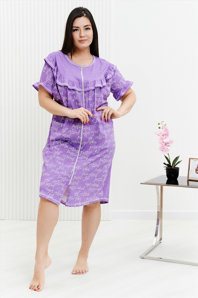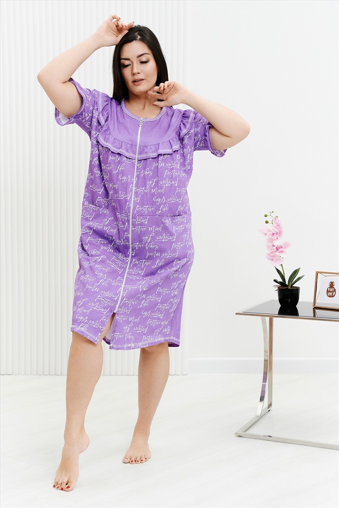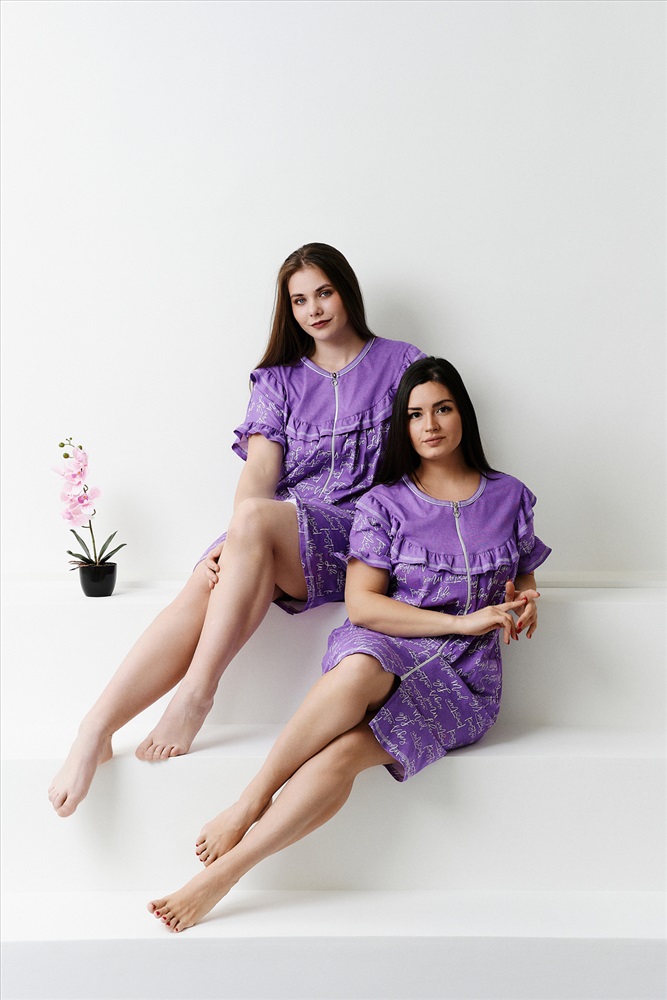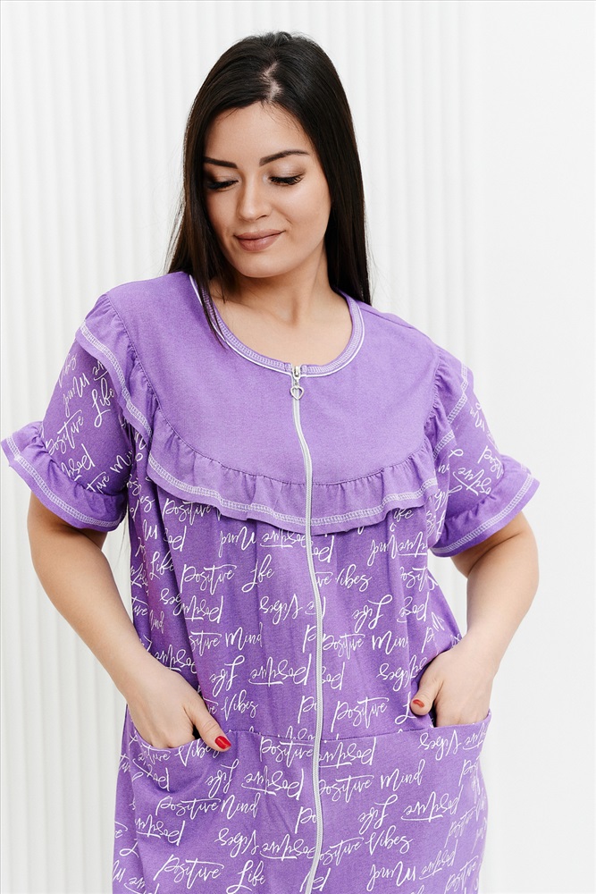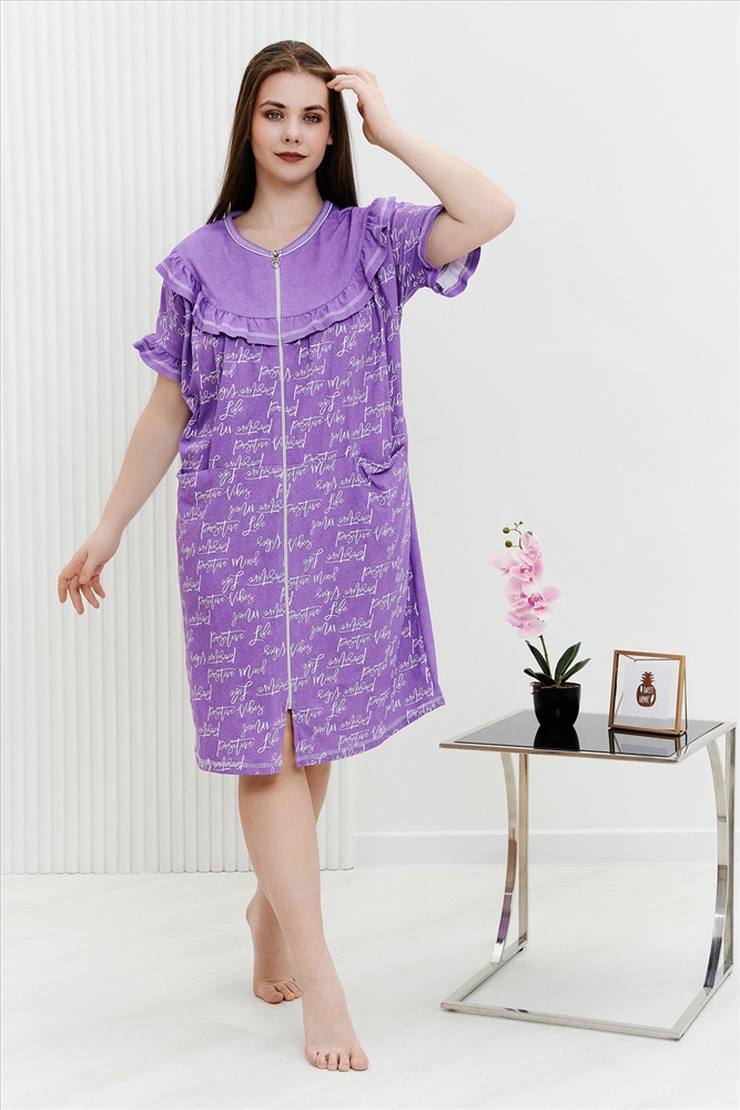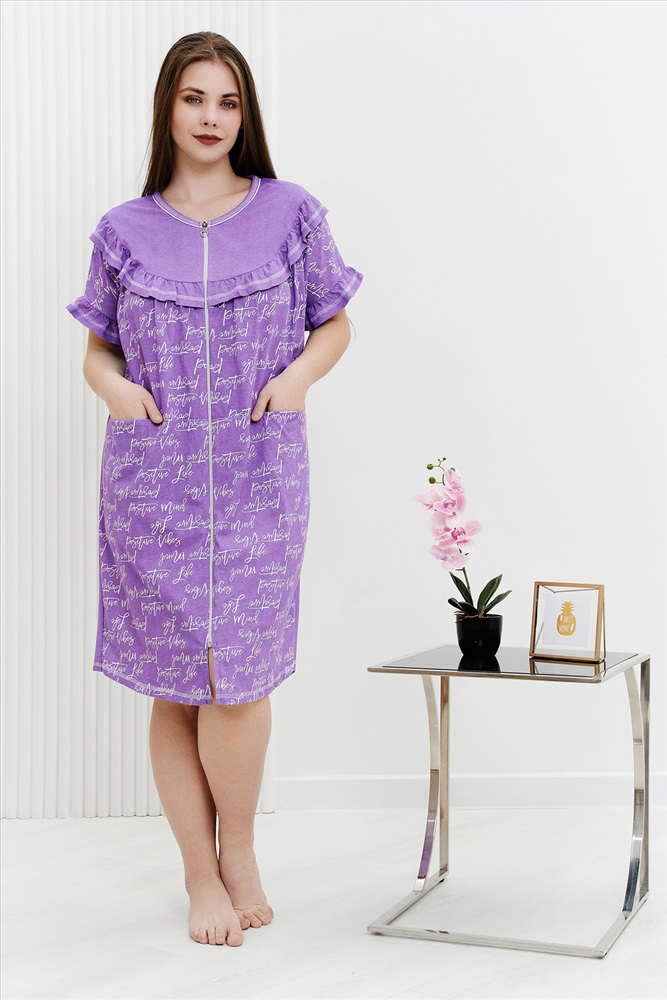 Застежка: молния Халат женский, полуприлегающего силуэта, горловина округлая, застежка на тесьму-молнию. На полочке кокетка с рюшей, также рюша внизу цельнокроенного короткого рукава из отделочной ткани. Внутренние горизонтальные карманы в шве стачивания верхней и нижней части полочки.