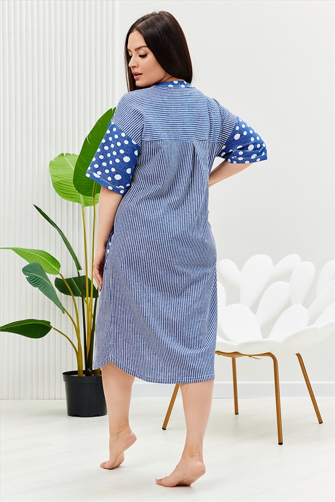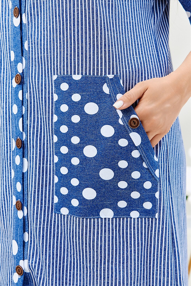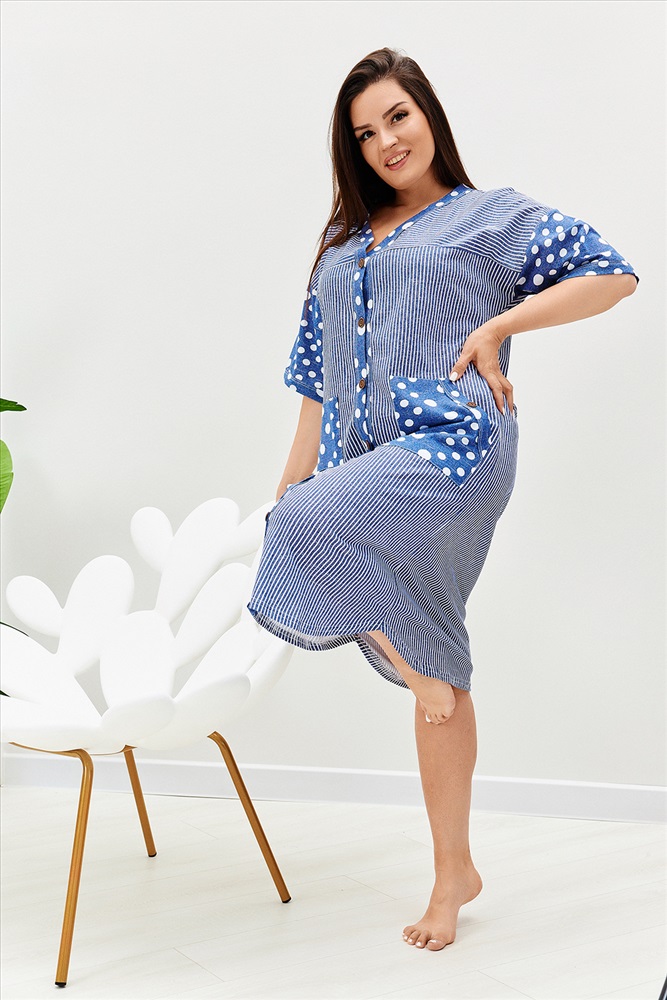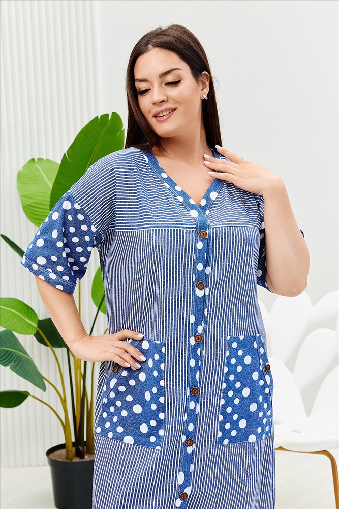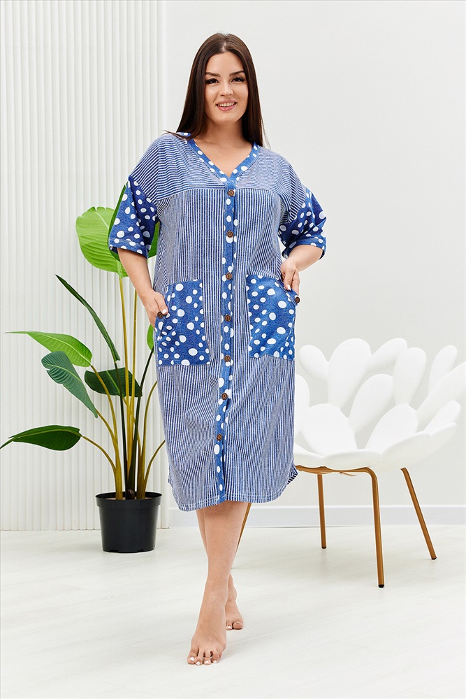 Застежка: пуговицы Халат женский прямого силуэта, расширение к низу за счет складки на спинке. Рукав короткий цельнокроенныйсо швом. На полочке и спинке кокетки и накладные карманы. Борт изделия, низ рукавов и вход в карман окантованы широкой бейкой из отделочной ткани. Сочетание отделки из гороха и основной ткани из полоски придают изделию особую актуальность.