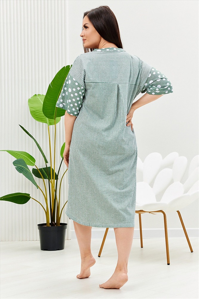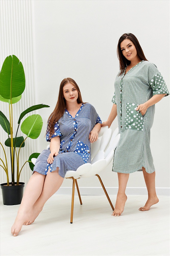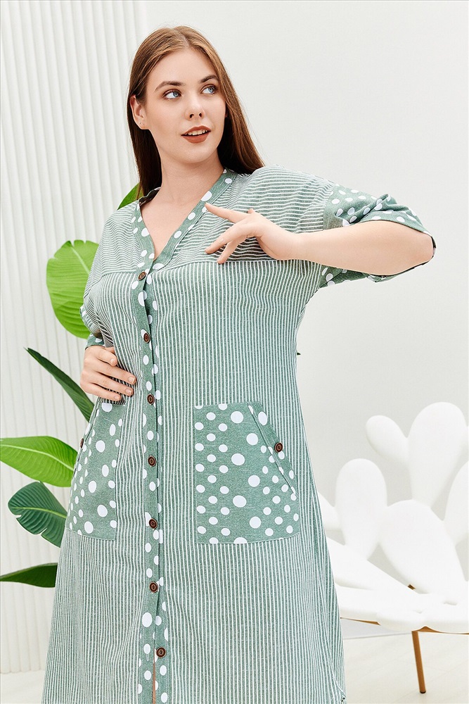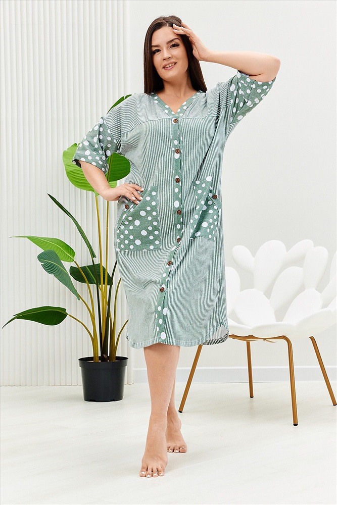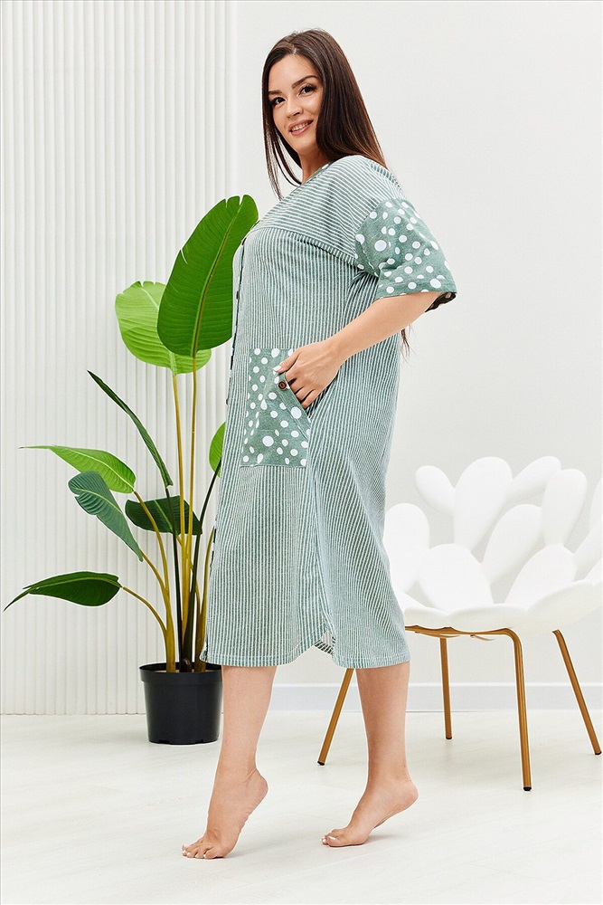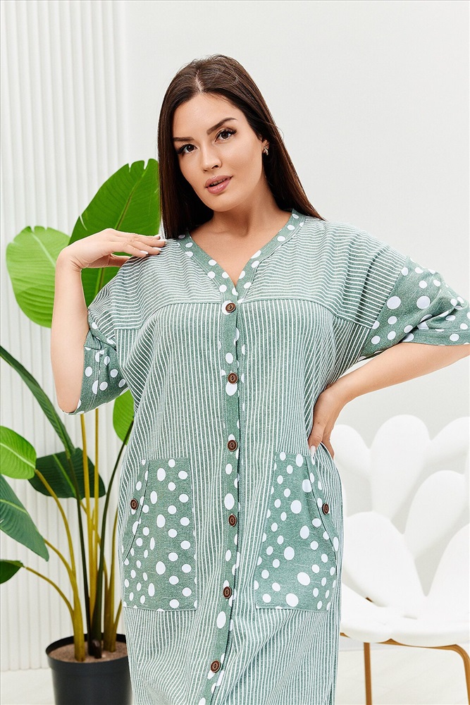 ID товара: 910811 Состав: Хлопок 100% Сезон: Демисезон Длина: Ниже колена Фасон: Прямой Рукав: Ниже локтя Вид застежки: Пуговицы Декоративные элементы: Карманы накладные Основная ткань: Хлопок Вид ткани: Кулирка Страна бренда: Россия Страна производства: Россия Халат женский прямого силуэта, расширение к низу за счет складки на спинке. Рукав короткий цельнокроенныйсо швом. На полочке и спинке кокетки и накладные карманы. Борт изделия, низ рукавов и вход в карман окантованы широкой бейкой из отделочной ткани. Сочетание отделки из гороха и основной ткани из полоски придают изделию особую актуальность. Комментарии к товару