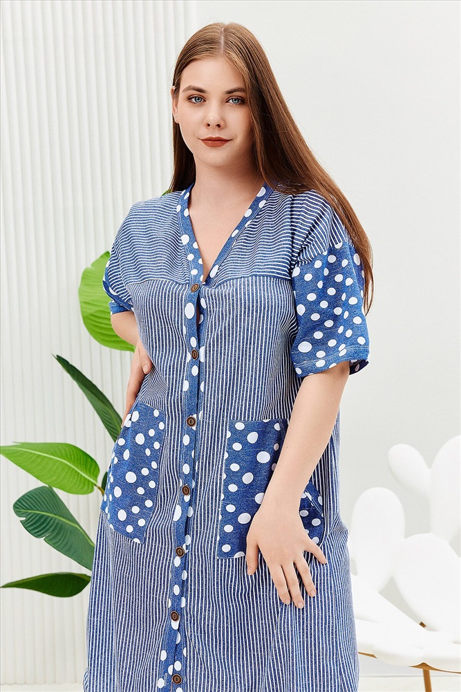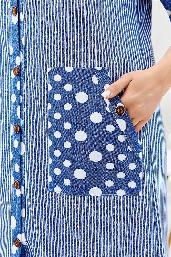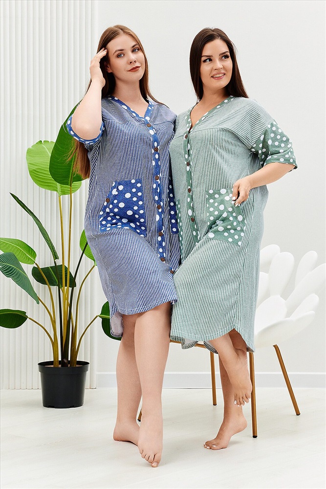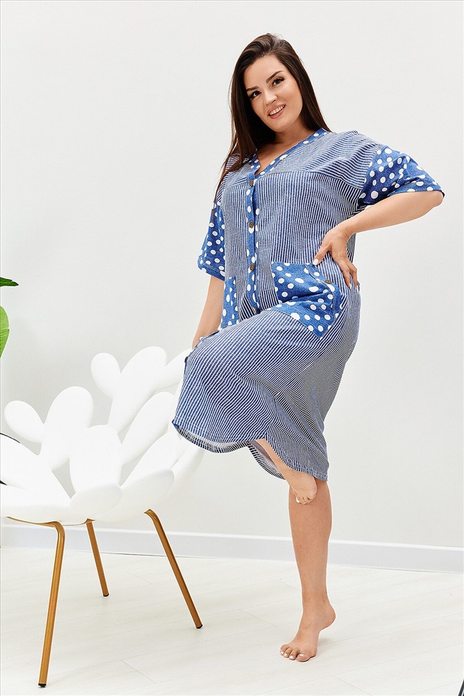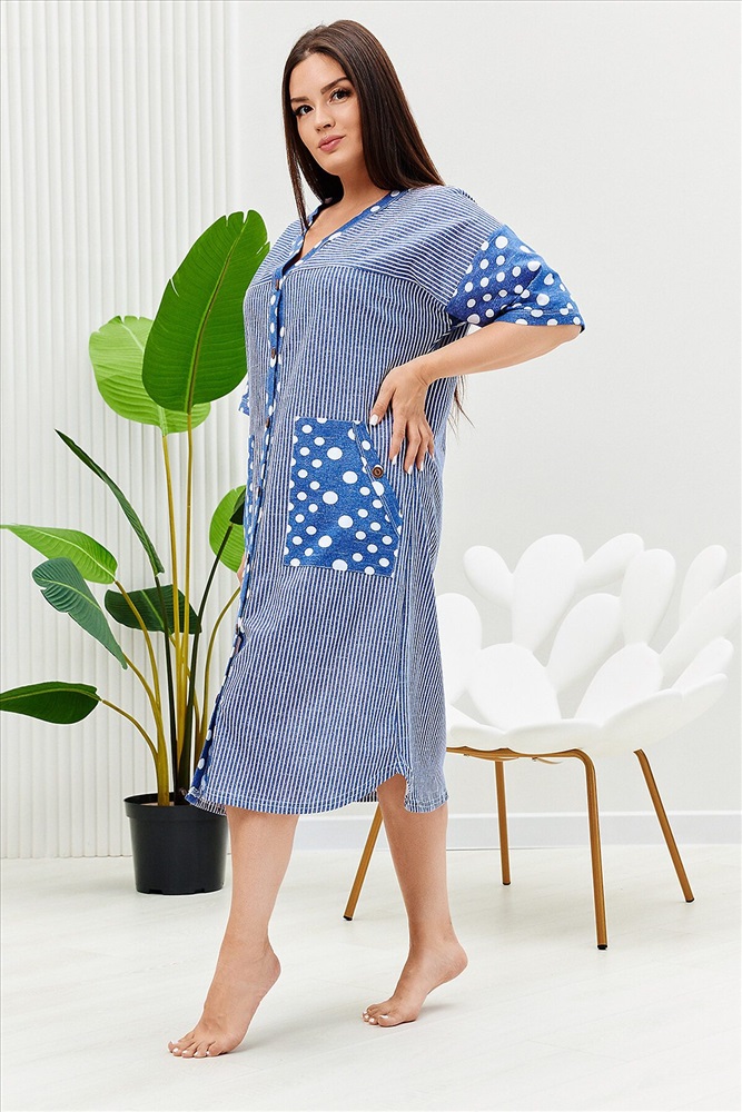 ID товара: 910812 Состав: Хлопок 100% Сезон: Демисезон Длина: Ниже колена Фасон: Прямой Рукав: Ниже локтя Вид застежки: Пуговицы Декоративные элементы: Карманы накладные Основная ткань: Хлопок Вид ткани: Кулирка Страна бренда: Россия Страна производства: Россия Халат женский прямого силуэта, расширение к низу за счет складки на спинке. Рукав короткий цельнокроенныйсо швом. На полочке и спинке кокетки и накладные карманы. Борт изделия, низ рукавов и вход в карман окантованы широкой бейкой из отделочной ткани. Сочетание отделки из гороха и основной ткани из полоски придают изделию особую актуальность. Комментарии к товару