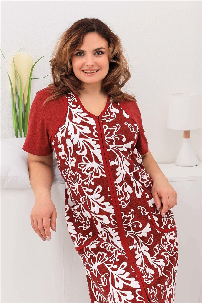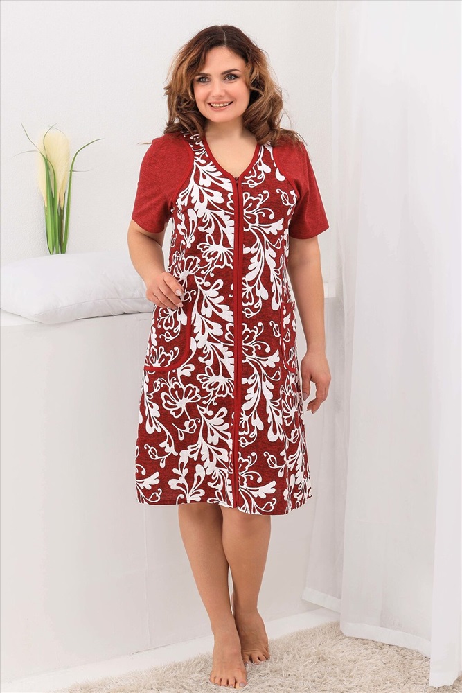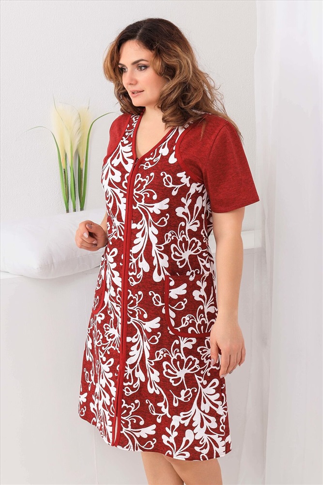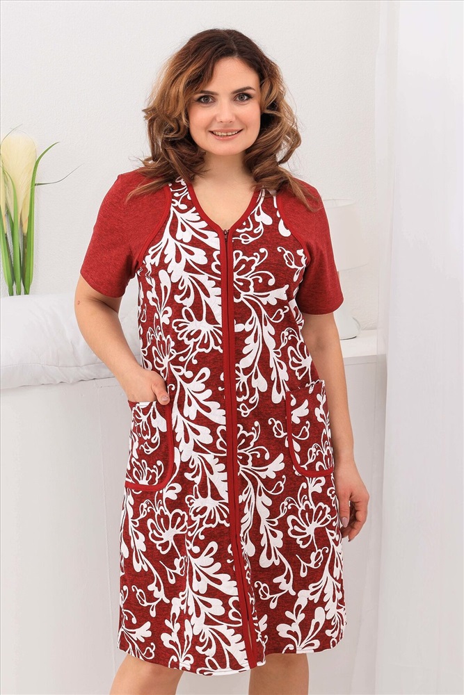 Халат женский на молнии. Перед с фигурной кокеткой, рукав короткий, в боковых швах два полупояса, два накладных кармана.Идеально подойдёт на любую фигуру, яркая расцветка, ткань 100% хлопок.