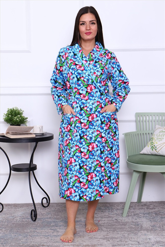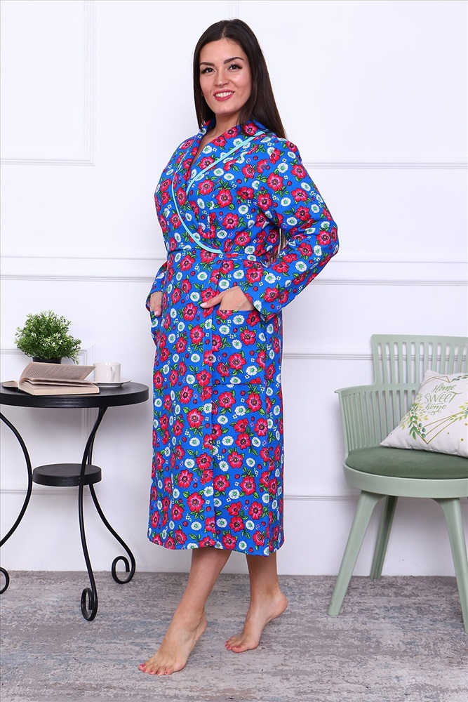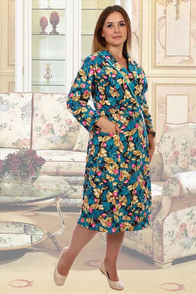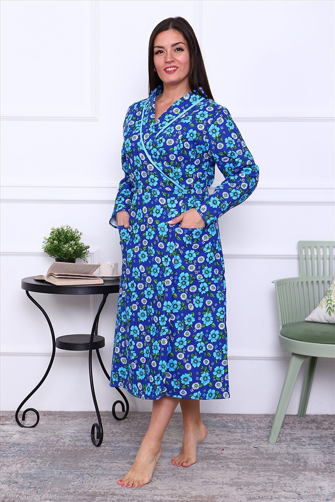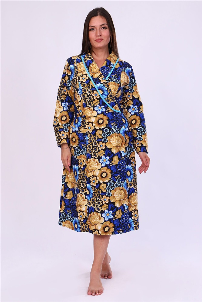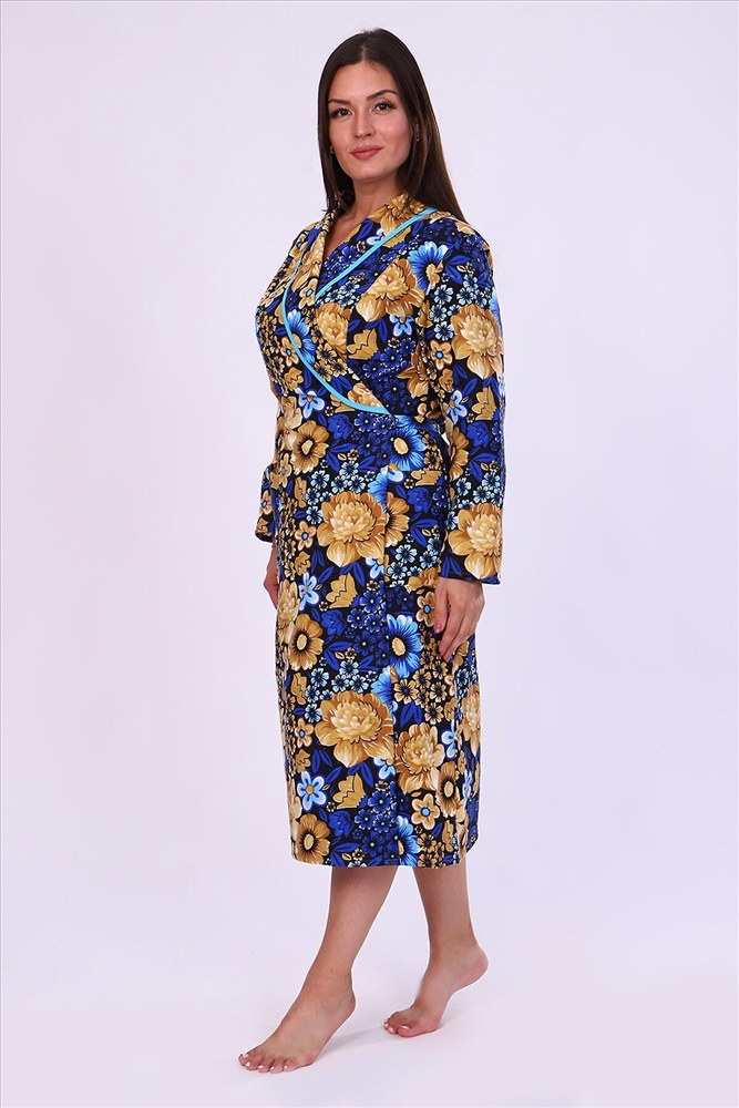 Халат фланелевый запашной, воротник-шалька, отделка из ткани бязь, рукав длинный втачной, полочка с рельефом, пояс выходит из рельефа и завязывается сзади