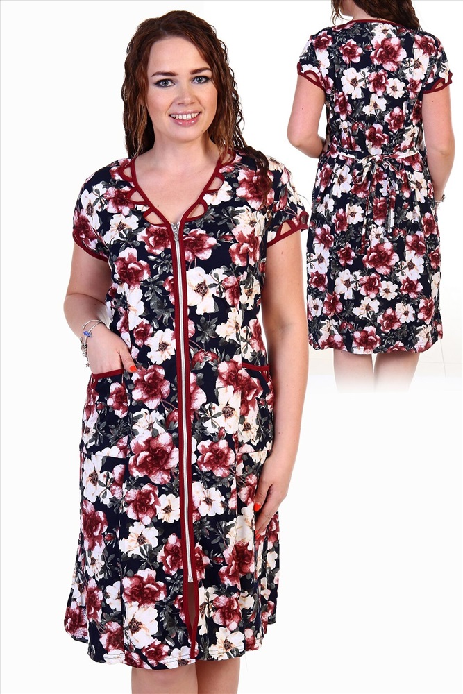 Страна производства: Россия Модный халат из кулирки. Короткие рукава, цветная окантовка, необычный дизайн воротника и рукавов, застегивается на молнию, длина приблизительно до коленей, по бокам имеются карманы, несколько вариантов расцветки. Размеры от 48 до 70.