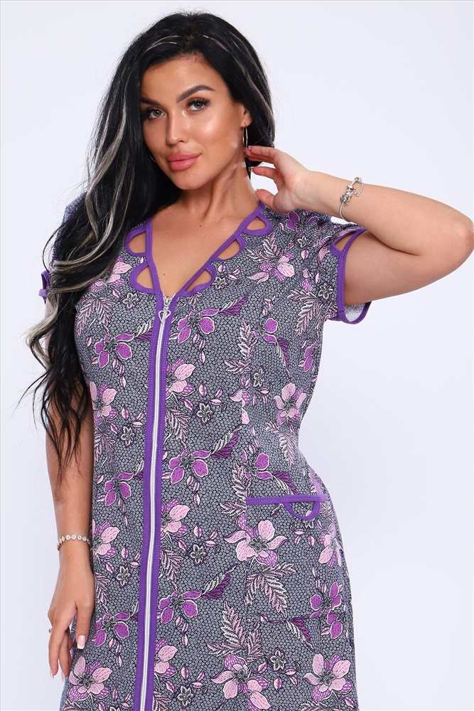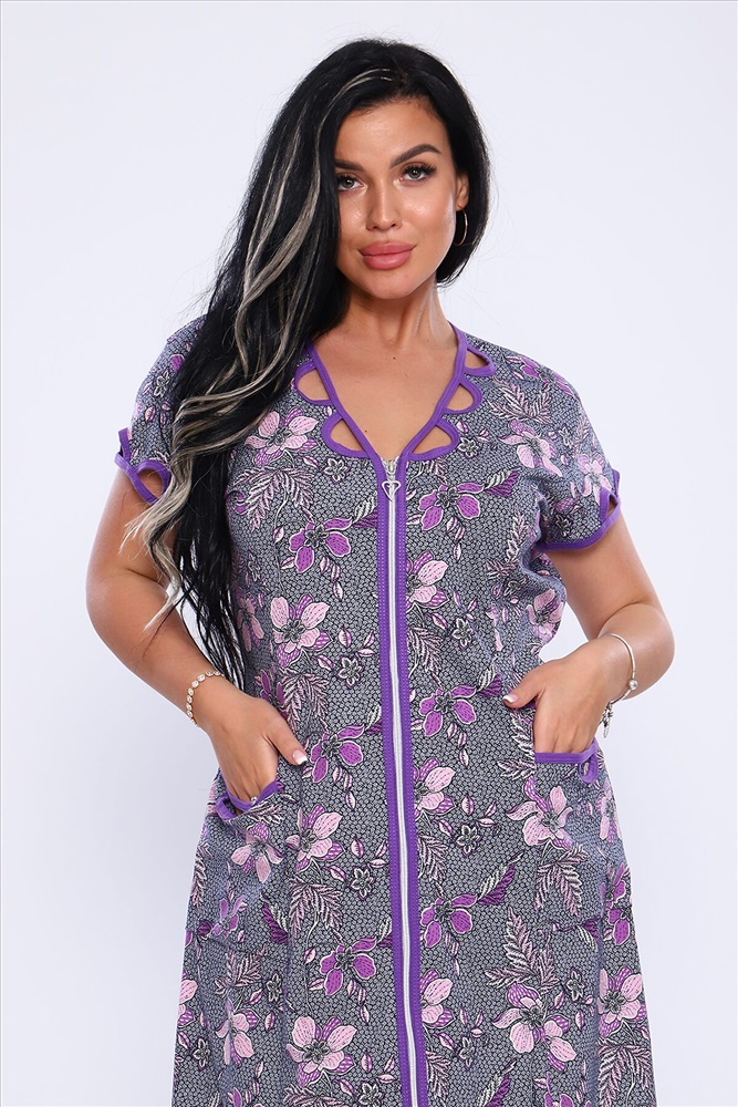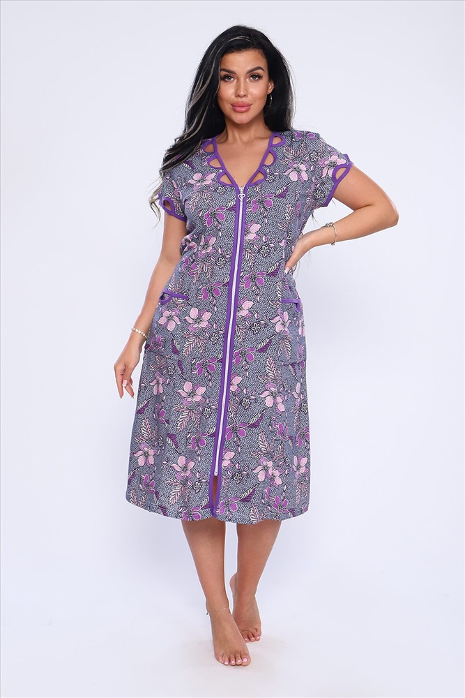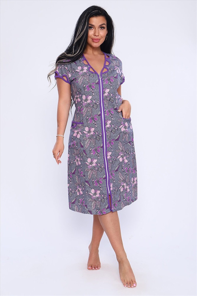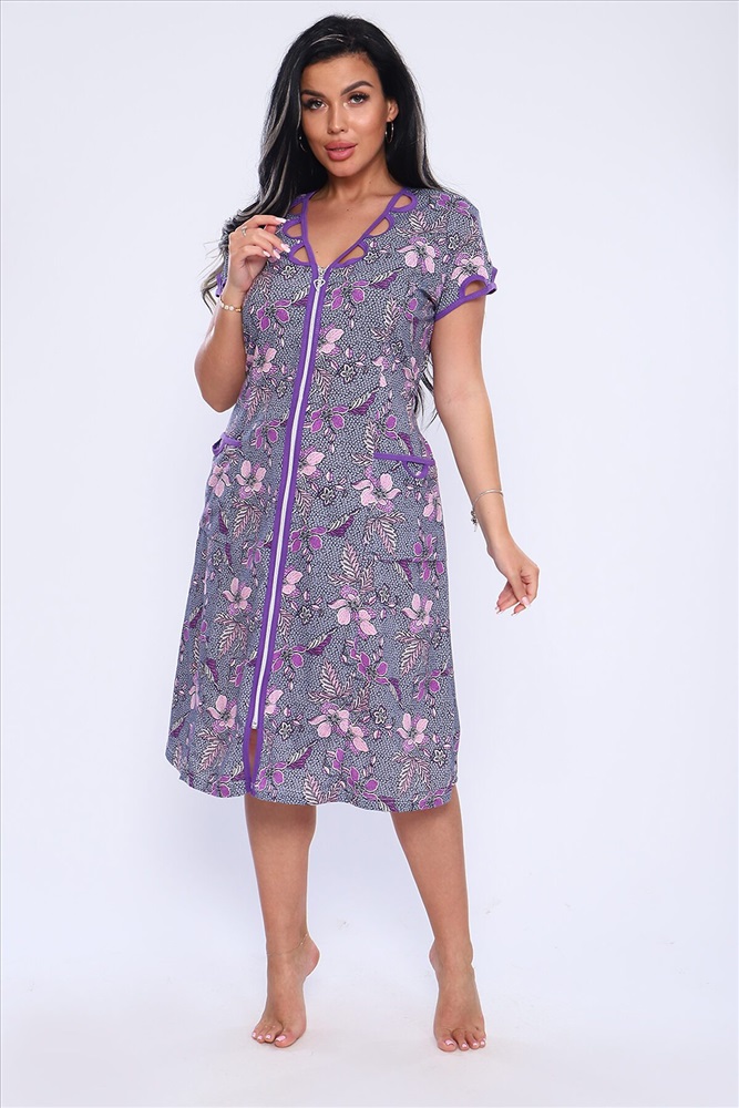 Страна производства: Россия Модный халат из кулирки. Короткие рукава, цветная окантовка, необычный дизайн воротника и рукавов, застегивается на молнию, длина приблизительно до коленей, по бокам имеются карманы, несколько вариантов расцветки.