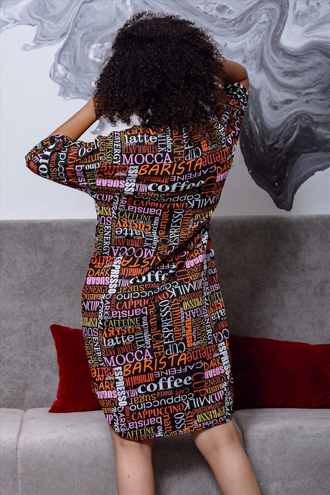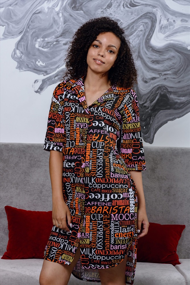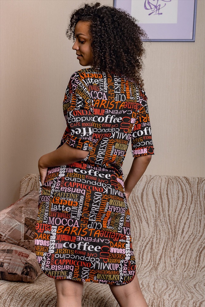 Страна производства: Россия Халат-туника на пуговицах свободного рубашечного кроя. Спущенная пройма. Рукава с манжетами. Низ халата обработан широкой бейкой. Разница в длине спинки и переда 10 см. Длина в замерах указана по спинке. Расцветка ткани с различными названиями кофе. Рекомендуется деликатная стирка