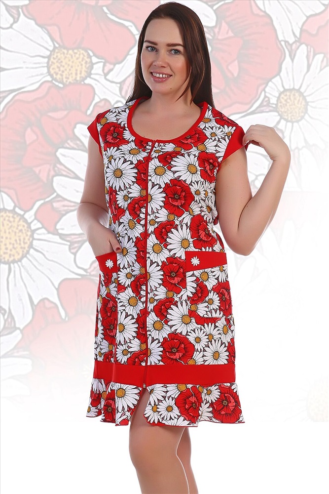 Страна производства: Россия Женский халат из кулирки. Ромашковый дизайн, окантовка в тон, застегивается на молнию, по бокам имеются карманы, цветные вставки внизу, на рукавах и карманах, общая длина чуть выше коленей. Несколько вариантов расцветки. Размеры от 44 до 62. Внимание, данный товар не продается в розницу!
