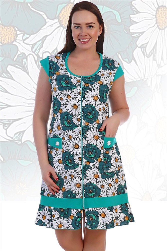 Женский халат из кулирки. Ромашковый дизайн, окантовка в тон, застегивается на молнию, по бокам имеются карманы, цветные вставки внизу, на рукавах и карманах, общая длина чуть выше коленей. Несколько вариантов расцветки. Размеры от 44 до 62. Внимание, данный товар не продается в розницу!