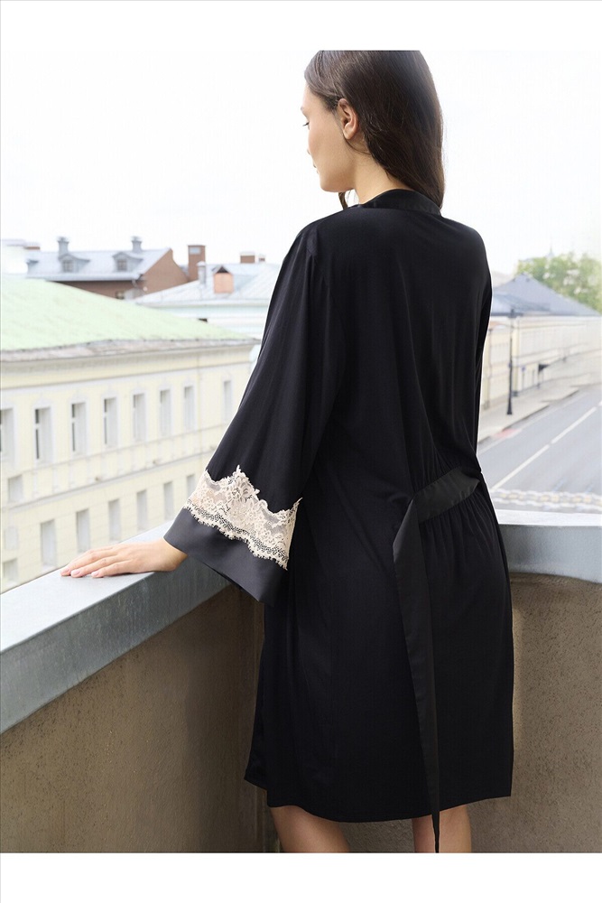 Страна производства: КНР Халат из мягкой вискозы, приятной и гладкой на ощупь. Борты, манжеты и пояс оформлены атласной тканью с легким блеском. Рукава украшены кружевом цвета шампанского — оно мягкое, не колется и комфортно прилегает к коже. Пришитый пояс фиксируется на линии талии. В месте его крепления по спине предусмотрена аккуратная сборка, подчеркивающая силуэт. Надежно зафиксировать посадку помогают внутренние завязки.