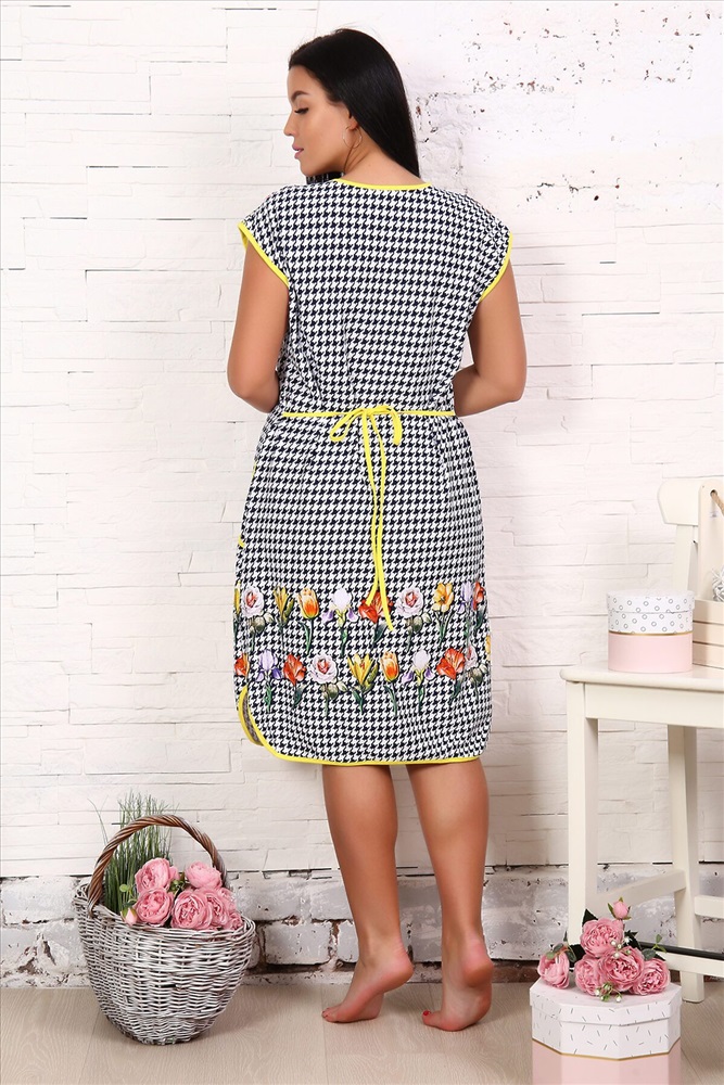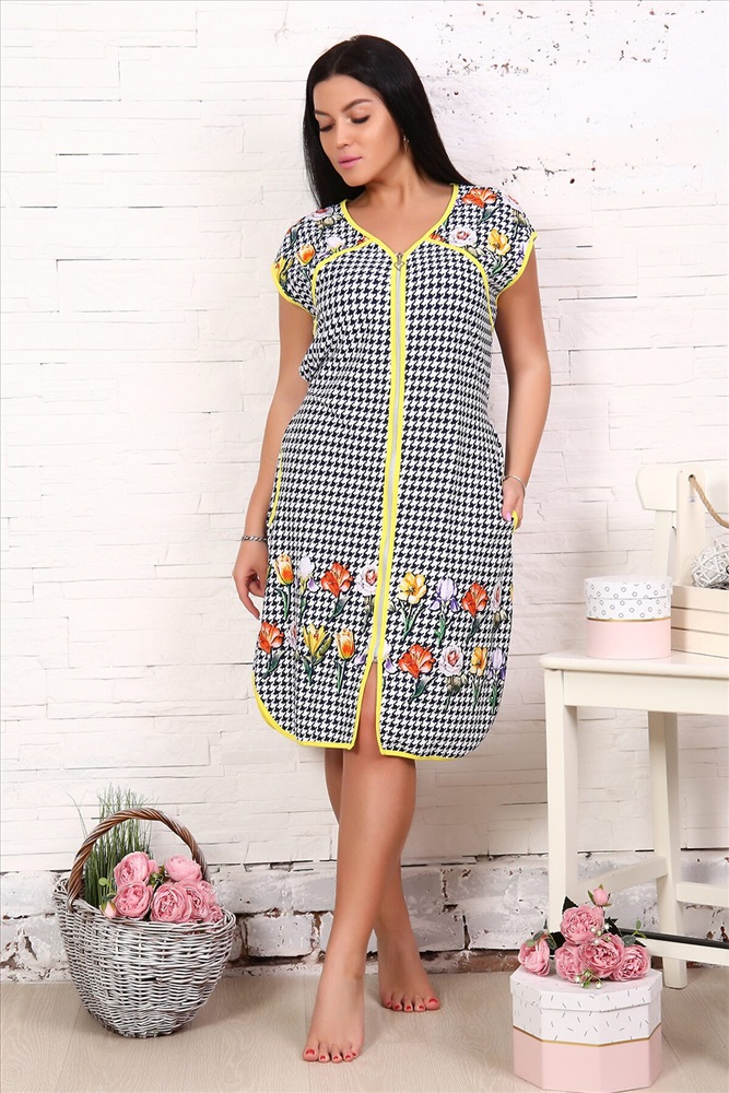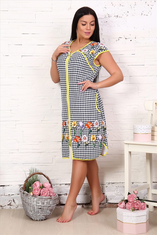 ID товара: 739138 Состав: 100% Хлопок Сезон: Демисезон Длина: прикрывает колено Фасон: Полуприлегающий Рукав: Короткие Вид застежки: Молния Декоративные элементы: Завязки Основная ткань: Хлопок | Кулирка Стиль: Повседневный Страна бренда: Россия Страна производства: Россия Легкий женский халат из кулирки. Контрастная окантовка, рукава отсутствуют, застегивается на молнию, сзади завязки, по бокам карманы, длина чуть выше коленей Комментарии к товару